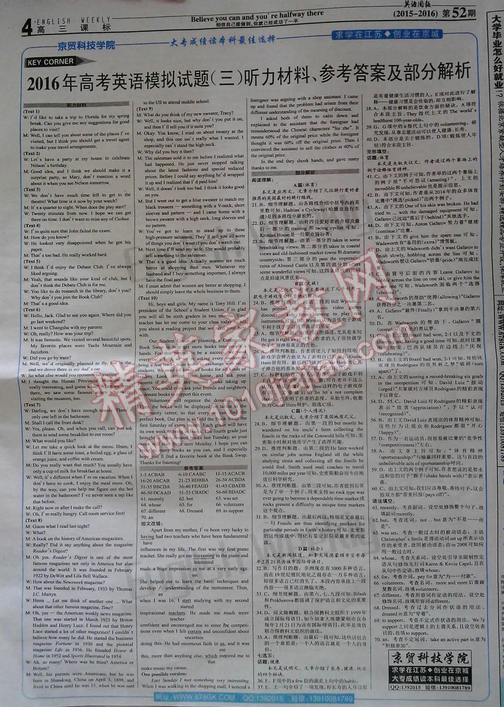2016年英语周报高三下学期新课标 第51期高考英语模拟试题(三)