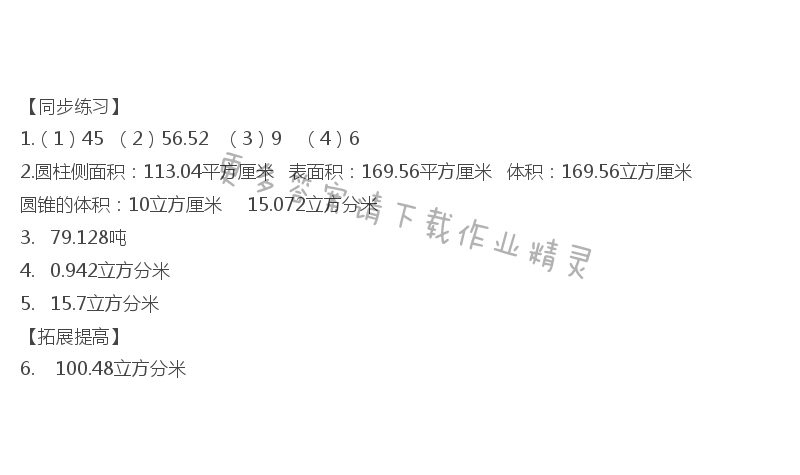 【同步练习】 1.(1)45(2)56.52 (3)9 (4)6 2.圆柱侧面积:113.04平方厘米 表面积:169.56平方厘米 体积:169.56立方厘米 圆锥的体积:10立方厘米 15.072立方分米 3. 79.128吨