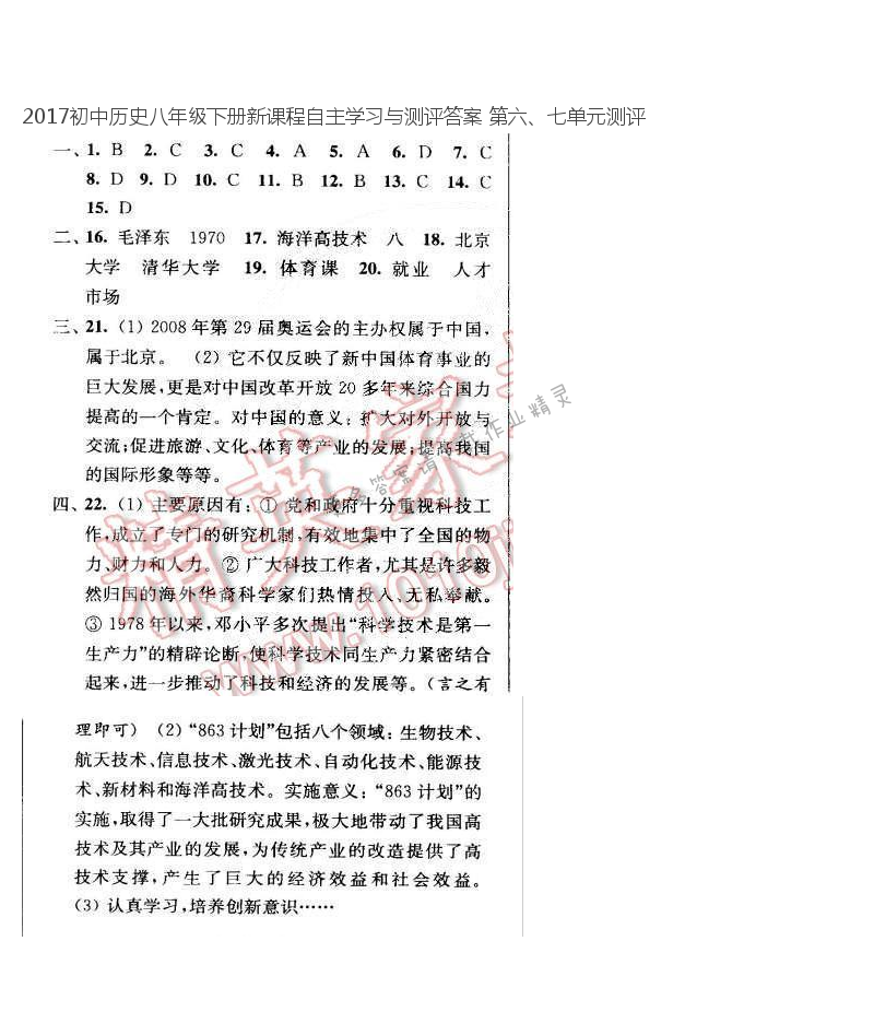 2017初中历史八年级下册新课程自主学习与测评答案 第六、七单元测评