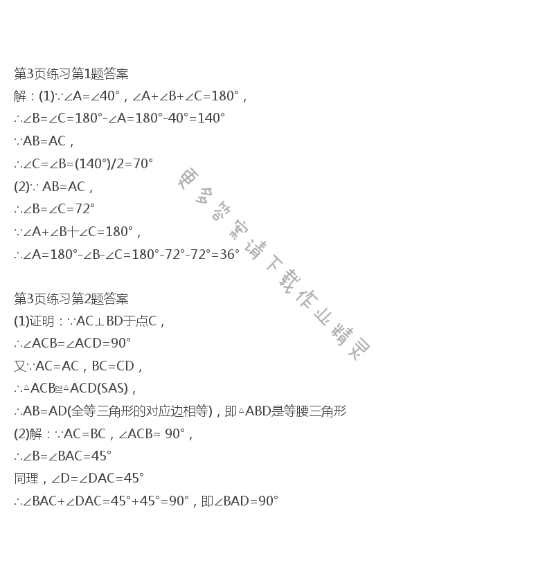 第3页练习第1题答案解:(1)∵∠A=∠40°,∠A+∠B+∠C=180°,∴∠B=∠C=180°-∠A=180°-40°=140°∵AB=AC,∴∠C=∠B=(140°)/2=70°(2)∵ AB=AC,∴∠B=∠C=72°∵∠A+∠B十∠C=180°,∴∠A=180°-∠B-∠C=180°-72°-72°=36°第3页练习第2题答案(1)证明:∵AC⊥BD于点C,∴∠ACB=∠ACD=90°又∵AC=AC,BC=CD,∴△ACB≌△ACD(SAS),∴AB=AD(全等