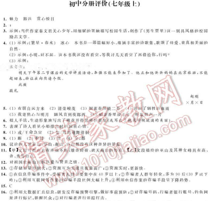 2017年绿色指标自我提升九年级语文 初中分册评价(七年级上)