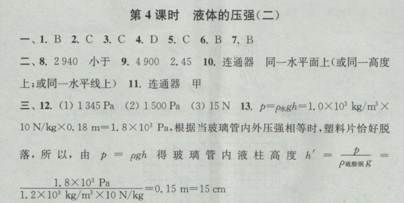 2017年通城学典活页检测八年级物理下册人教版第九章 第4课时