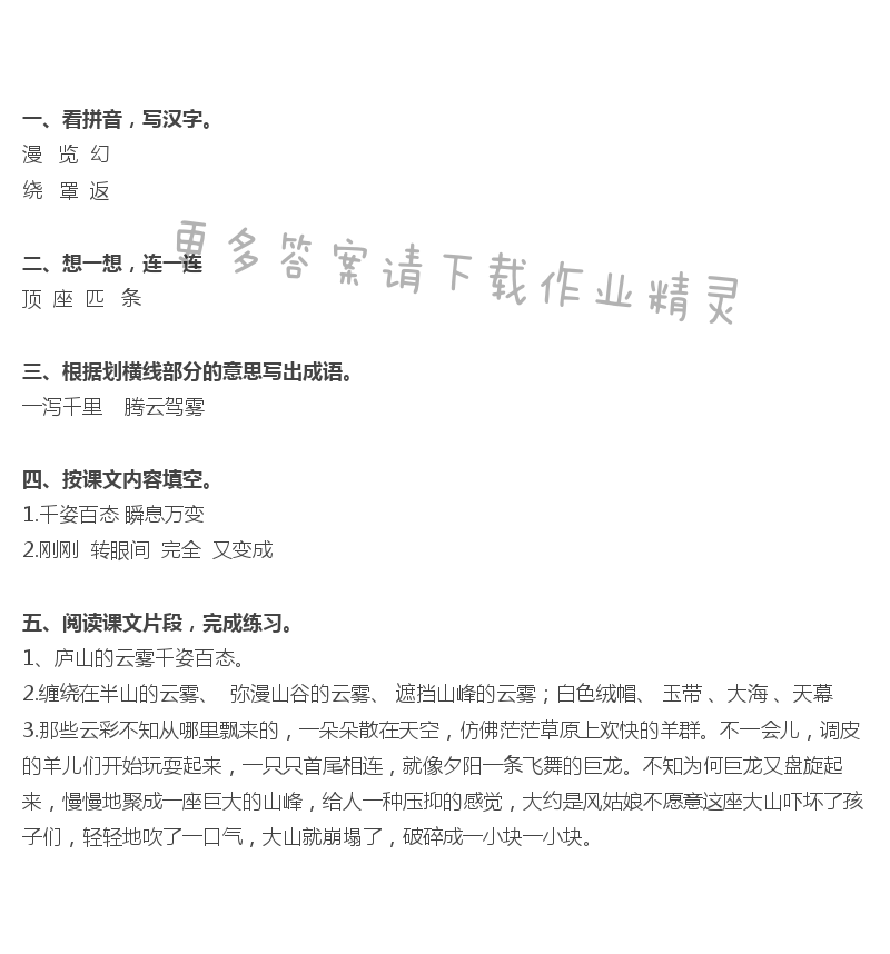 一、看拼音,写汉字。漫 览 幻绕 罩 返二、想一想,连一连顶座匹 条三、根据划横线部分的意思写出成语。一泻千里 腾云驾雾四、按课文内容填空。1.千姿百态 瞬息万变2.刚刚转眼间完全又变成五、阅读课文片段,完成练习。1、庐山的云雾千姿百态。2.缠绕在半山的云雾、弥漫山谷的云雾、 遮挡山峰的云雾;白色绒帽、 玉带 、大海 、天幕3.那些云彩不知从哪里飘来的,一朵朵散在天空,仿佛茫茫草原上欢快的羊群。不一会儿,调皮的羊儿们开始玩耍起来,一只只首尾相