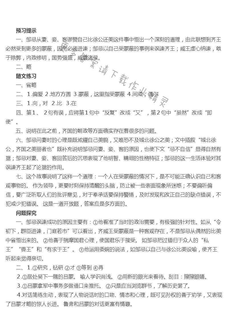 预习提示一、邹忌从妻、妾、客谬赞自己比徐公还美这件事中悟出一个深刻的道理,由此联想到齐王必然受到更多的蒙蔽,因而必须进谏;邹忌以自己受蒙蔽的事例来讽谏齐王;威王虚心纳谏,敢于除弊,内政修明,国势强盛,威震诸侯。 二、略随文练习一、省略二、1.偏爱 2.地方方圆 3.蒙蔽,这里指受蒙蔽 4.间或,偶尔 三、1.向,对2.比3.在 四、第1、 2句有误,应将第1句中“反复”改成“又”,第2句中“虽然”改成“即使”。 五、说明在此之前,齐国的朝政等方面确实存在着很多的问题。 六、邹忌问妻时的心理是既炫耀自己美貌,又唯恐不及城北徐公之美;文中插叙“城北徐公,齐国之美丽者也”既补充说明邹忌问妻、妾、客的原因,也使下文“忌不自信”显得自然有据;邹忌对妻、妾、客回答后的沉思表现了他明智、精细的性格特征;邹忌的这一生活体验对其讽谏齐王起了论据的作用。 七、这个故事说明了这样一个道理:一个人在受蒙蔽的情况下,是不可能正确认识自己和客观事物的。 作为领导,更要时刻保持清醒的头脑,防止被一些表面现象所迷惑;不要偏听偏信,要广泛听取人们的批评意见,对于奉承话要保持警惕,及时发现和改正自己的缺点错误,不犯或少犯错误。 这是一道开放题,答案应是多方面的。问题探究一、邹忌讽谏成功的原因主要有:①他看准了当时的政治需要,有极强的针对性。如从“令初下,群臣进谏,门庭若市”可以看出,齐威王受蒙蔽是一种客观存在,不是邹忌从偶然的比  |