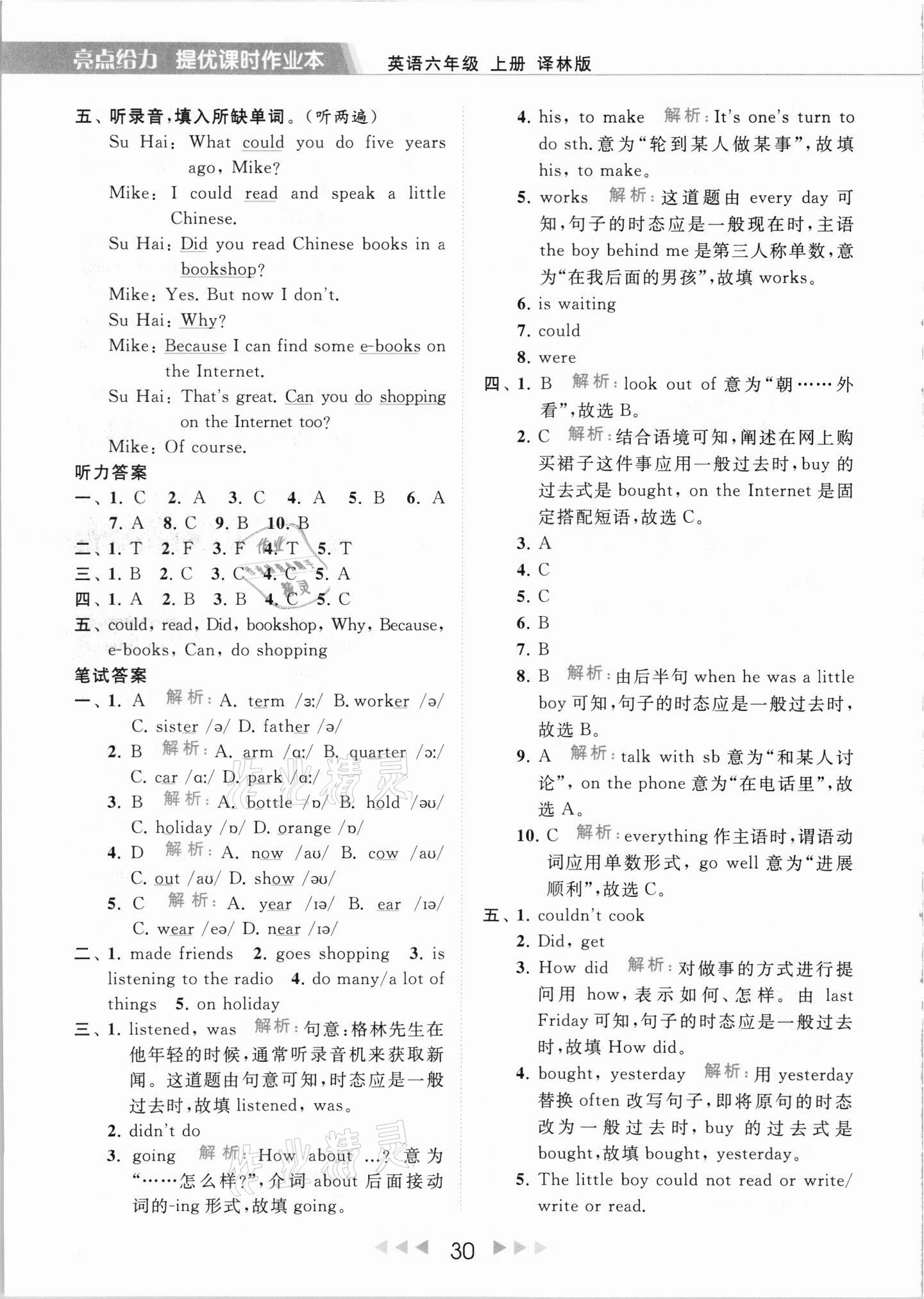 2021年亮点给力提优课时作业本六年级英语上册译林版第30页