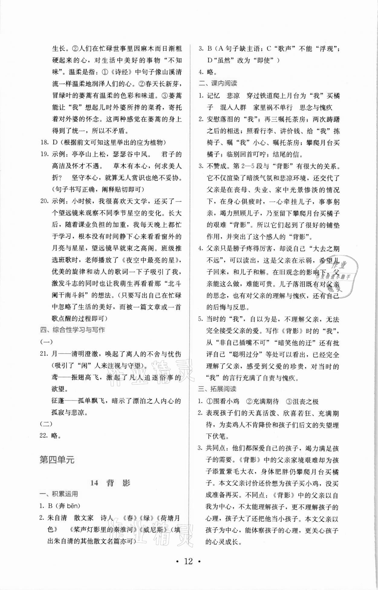 2021年人教金学典同步解析与测评八年级语文上册人教版参考答案第12页