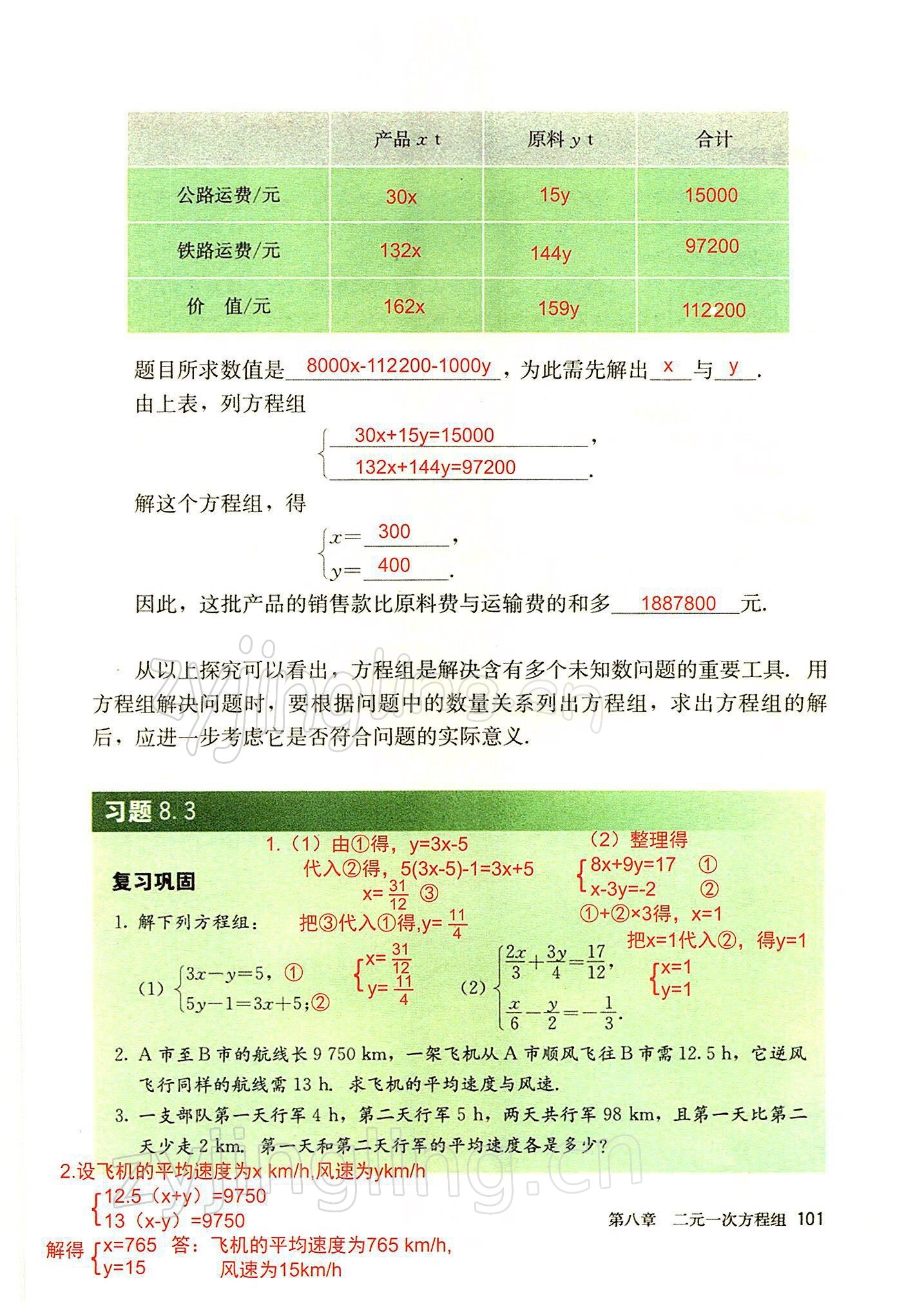 2022年教材课本七年级数学下册人教版参考答案第101页