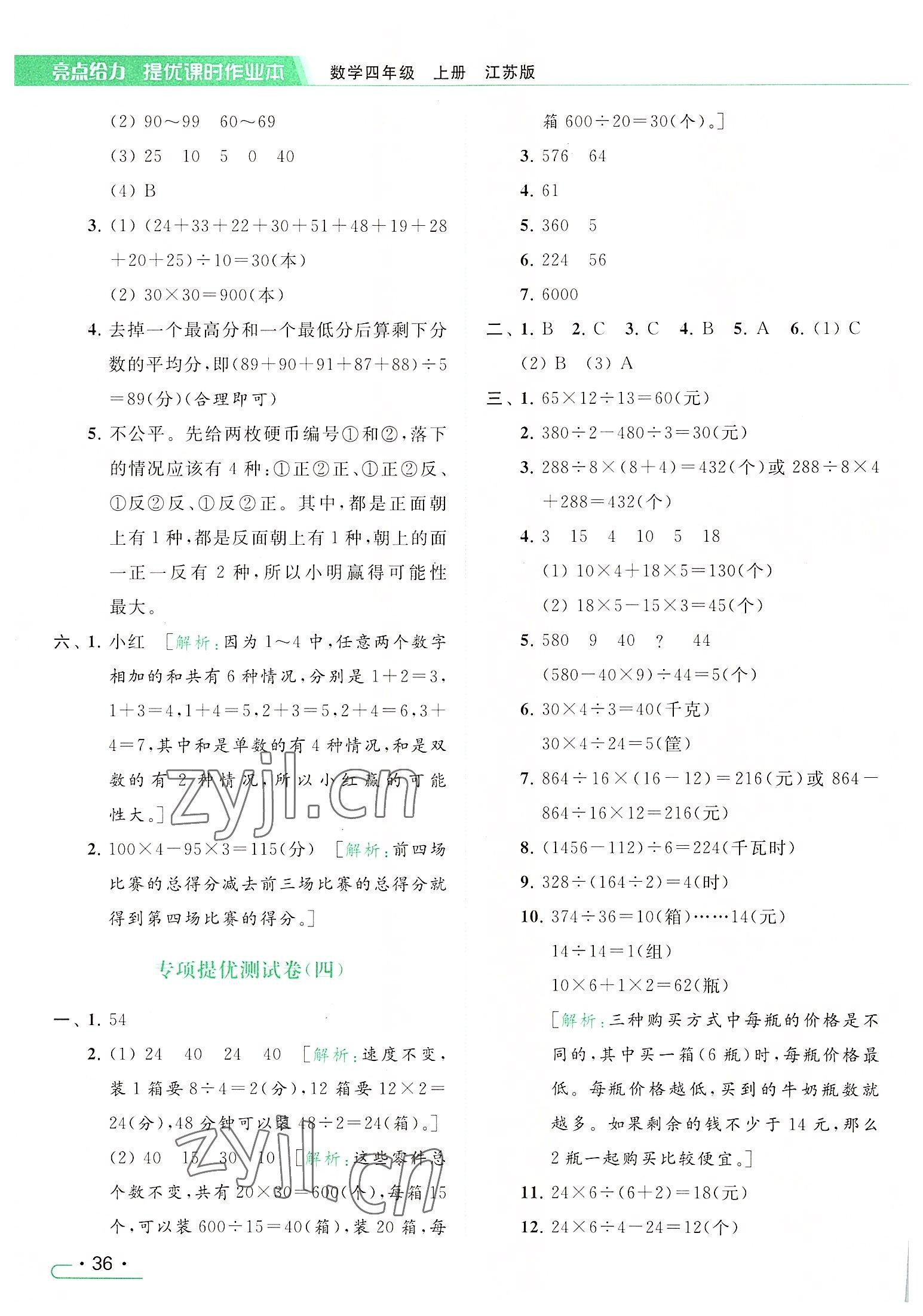 2022年亮点给力提优课时作业本四年级数学上册江苏版参考答案第36页