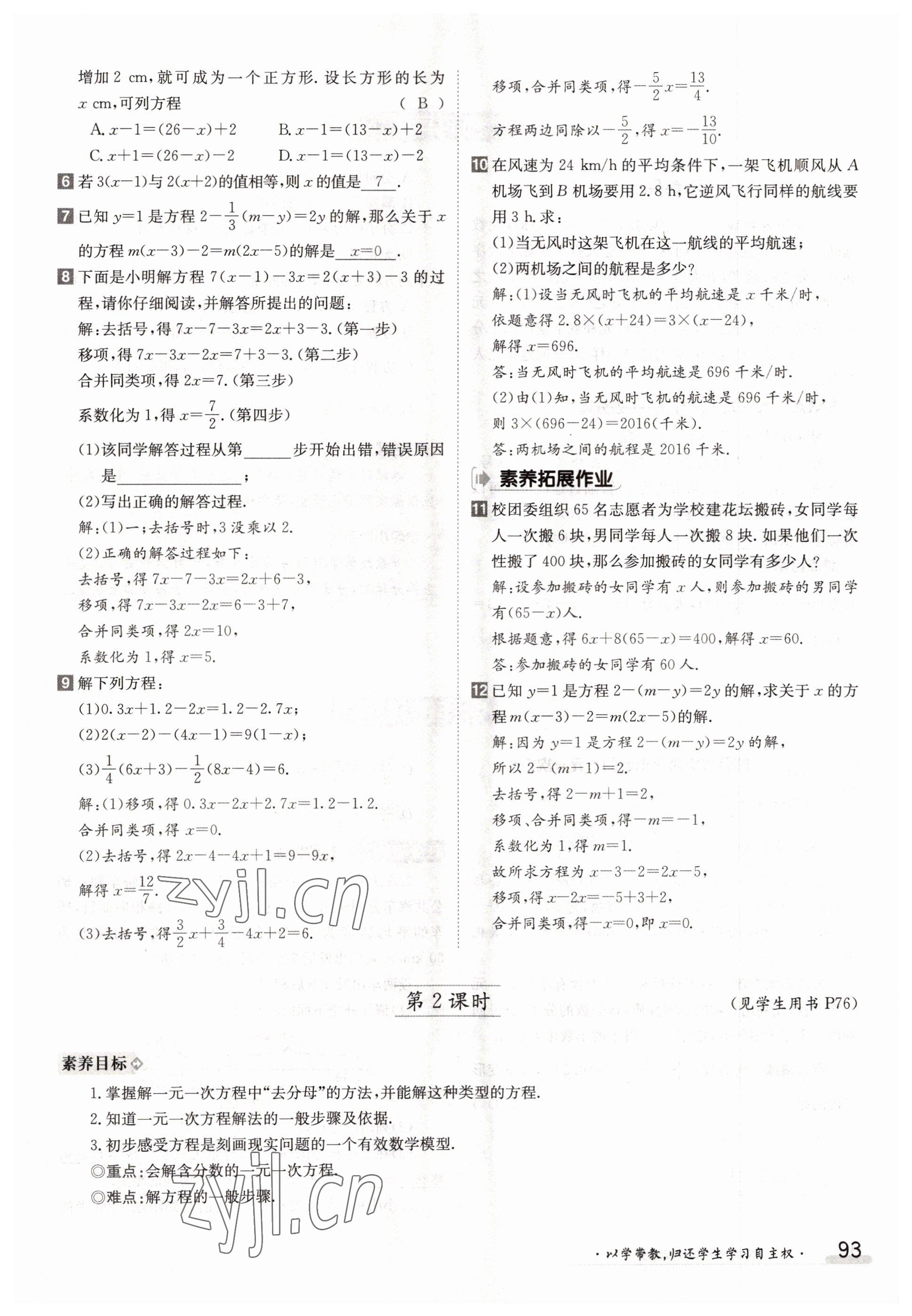 2022年金太阳导学案七年级数学上册人教版参考答案第93页