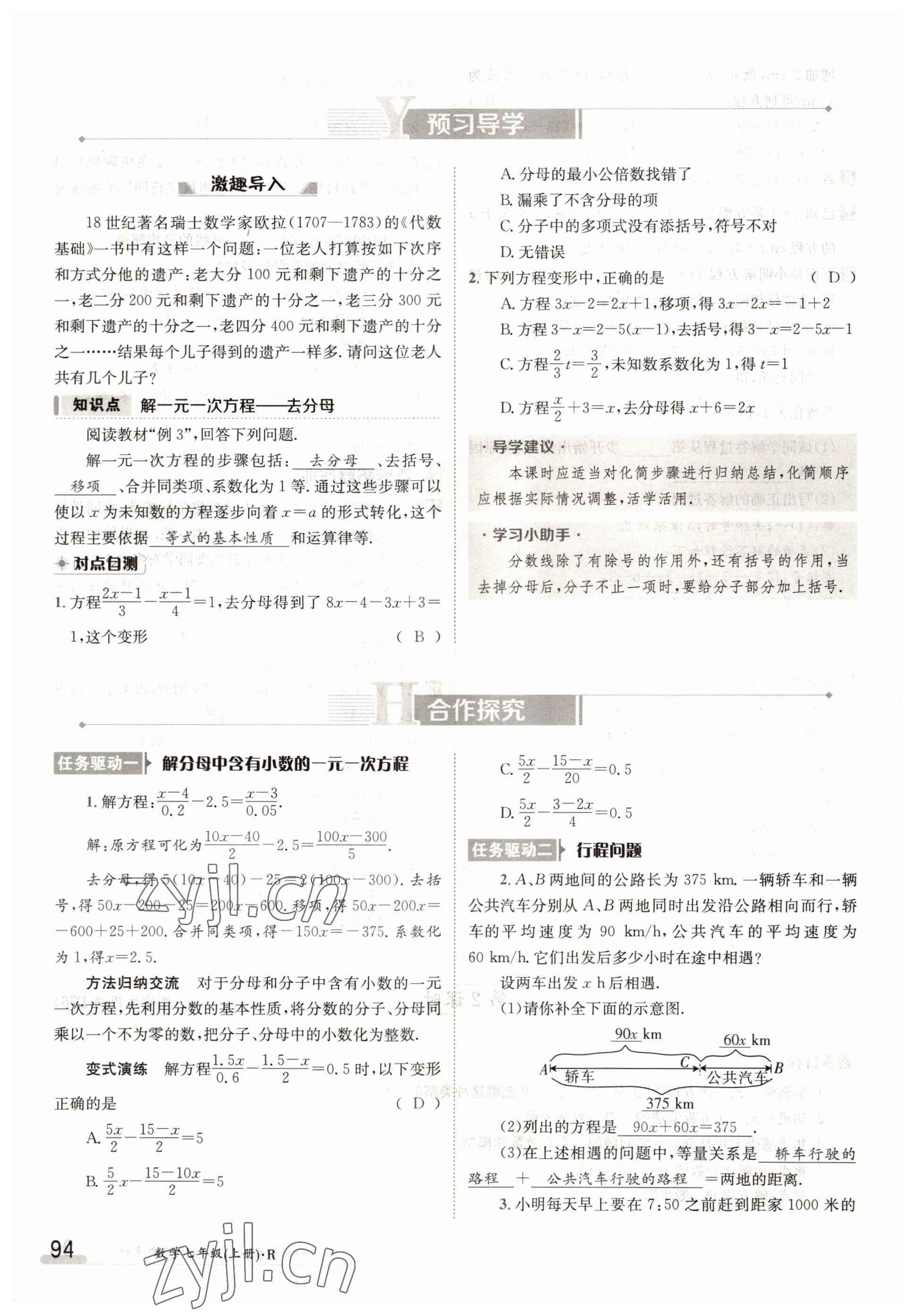 2022年金太阳导学案七年级数学上册人教版参考答案第94页