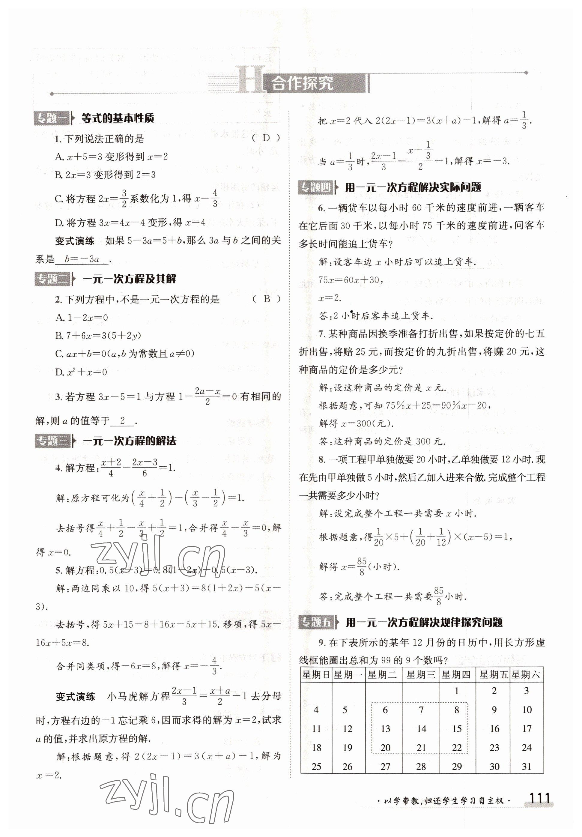 2022年金太阳导学案七年级数学上册人教版参考答案第111页