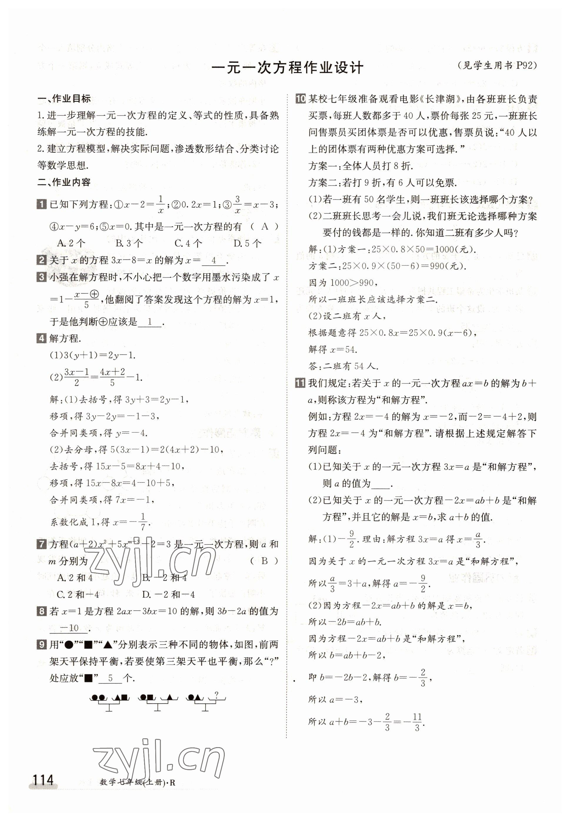 2022年金太阳导学案七年级数学上册人教版参考答案第114页