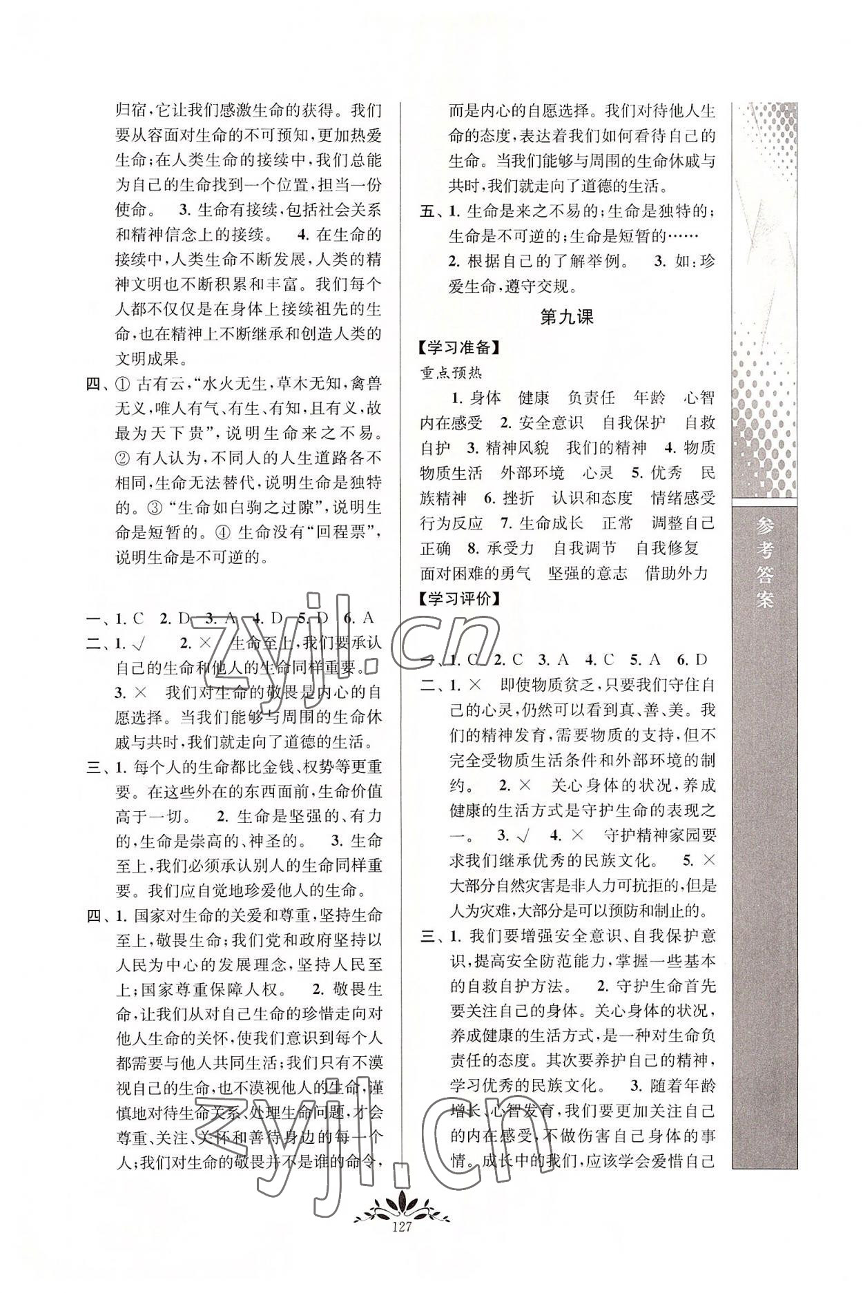2022年新课程自主学习与测评七年级道德与法治上册人教版参考答案第8页