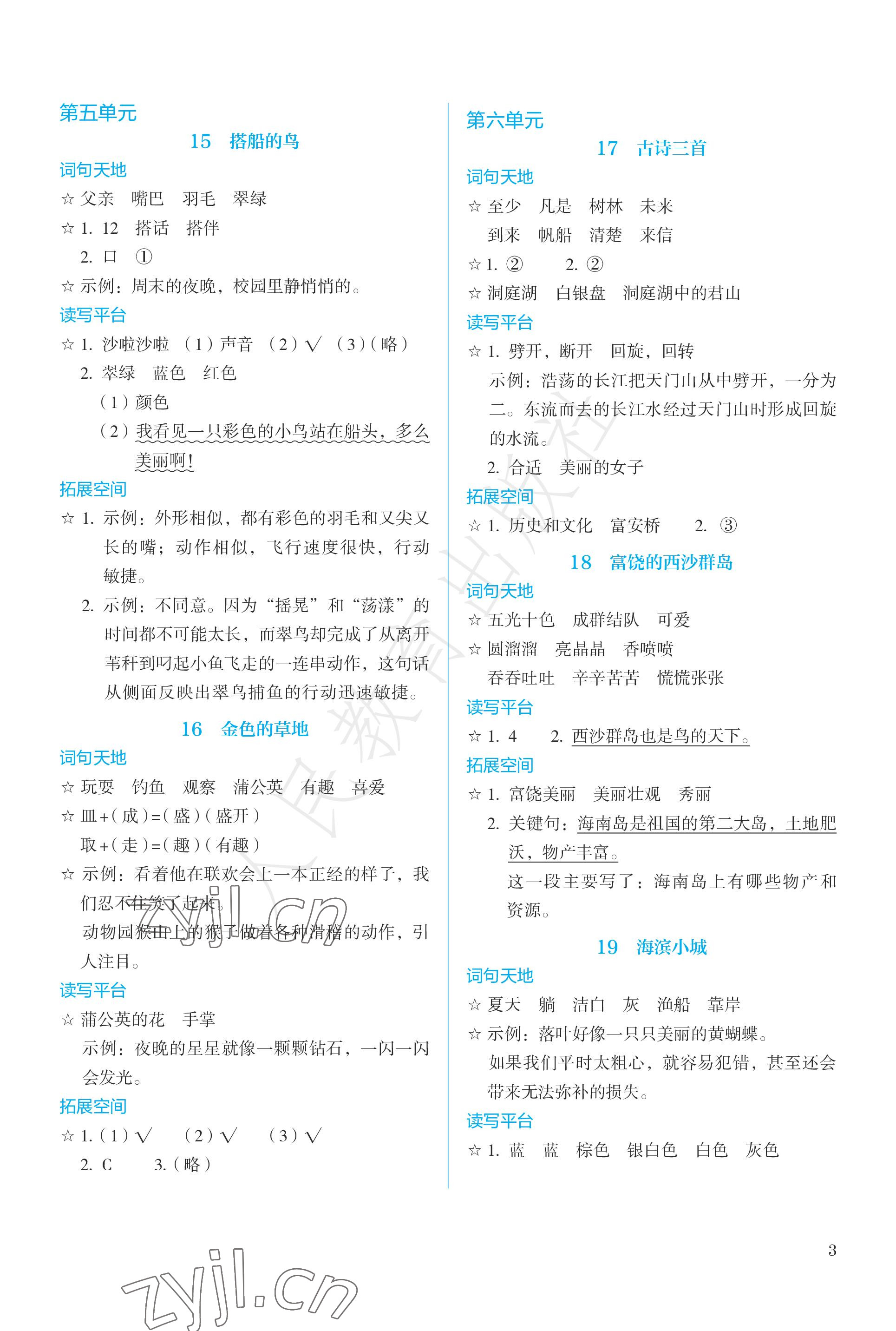2022年人教金学典同步解析与测评三年级语文上册人教版参考答案第3页