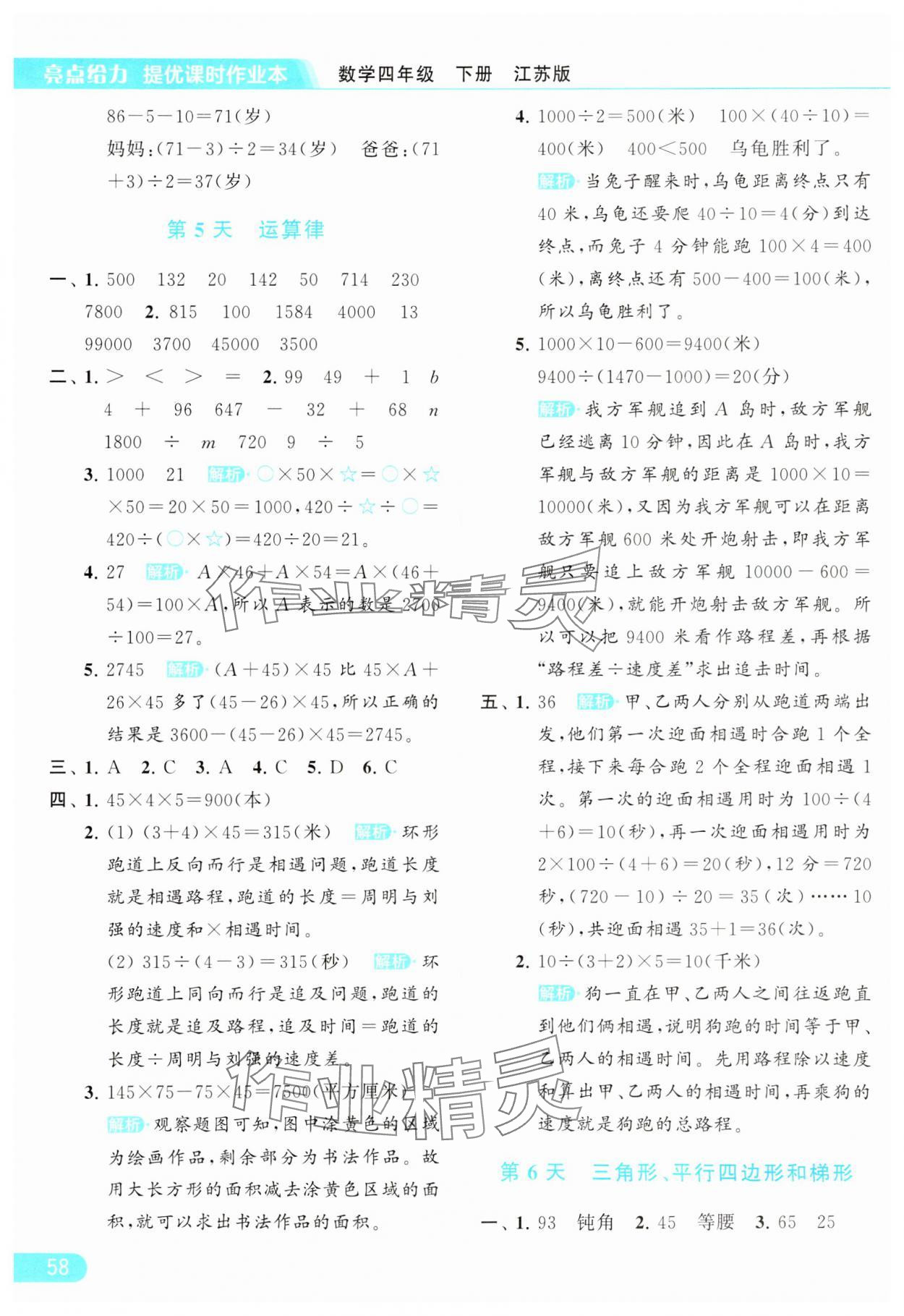 2024年亮点给力提优课时作业本四年级数学下册江苏版参考答案第58页