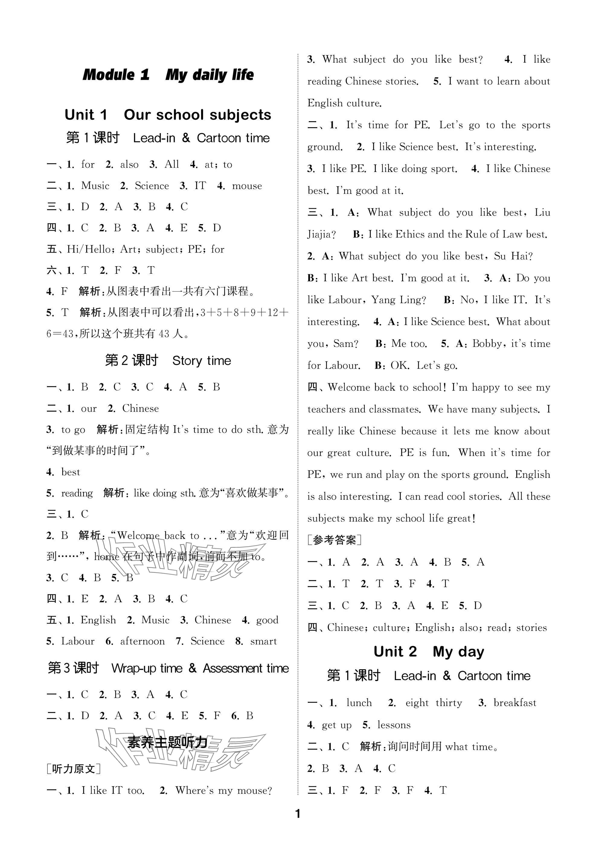 2025年课时作业本闯关练四年级英语上册译林版参考答案第1页