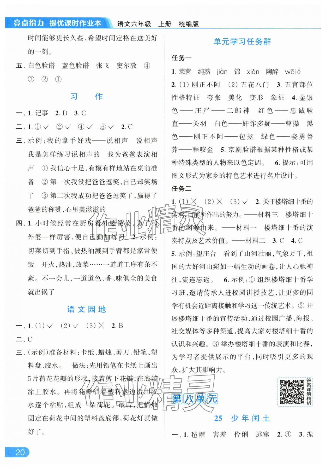 2025年亮点给力提优课时作业本六年级语文上册人教版参考答案第20页