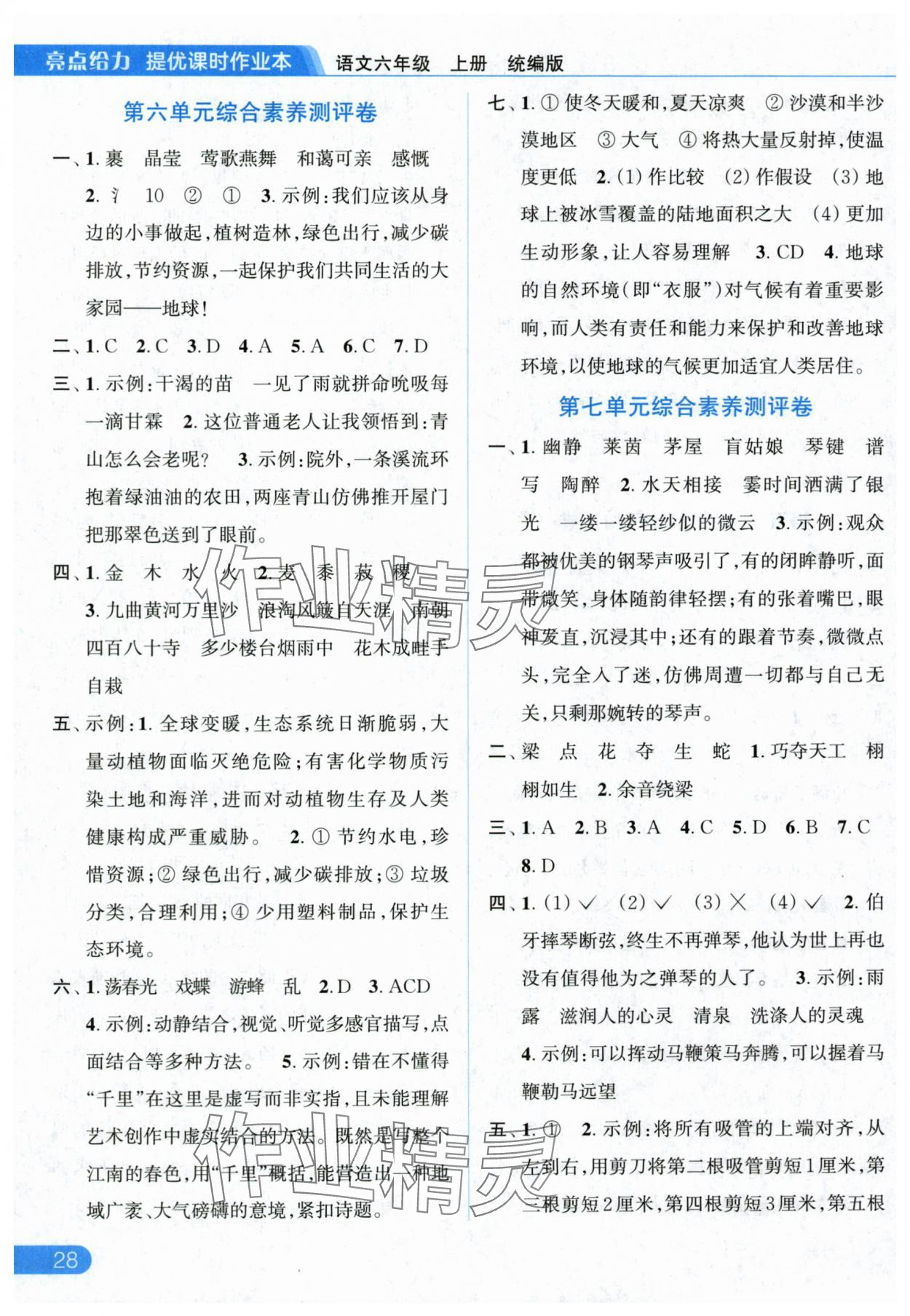 2025年亮点给力提优课时作业本六年级语文上册人教版参考答案第28页