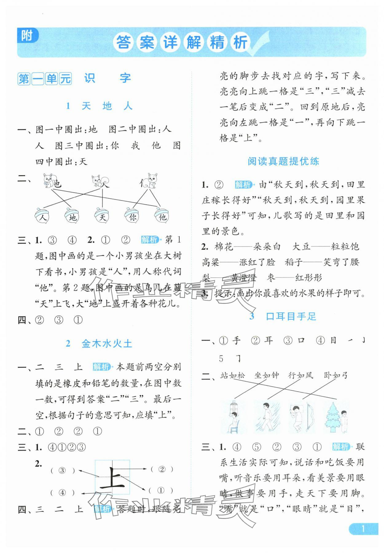 2025年亮点给力提优课时作业本一年级语文上册人教版参考答案第1页