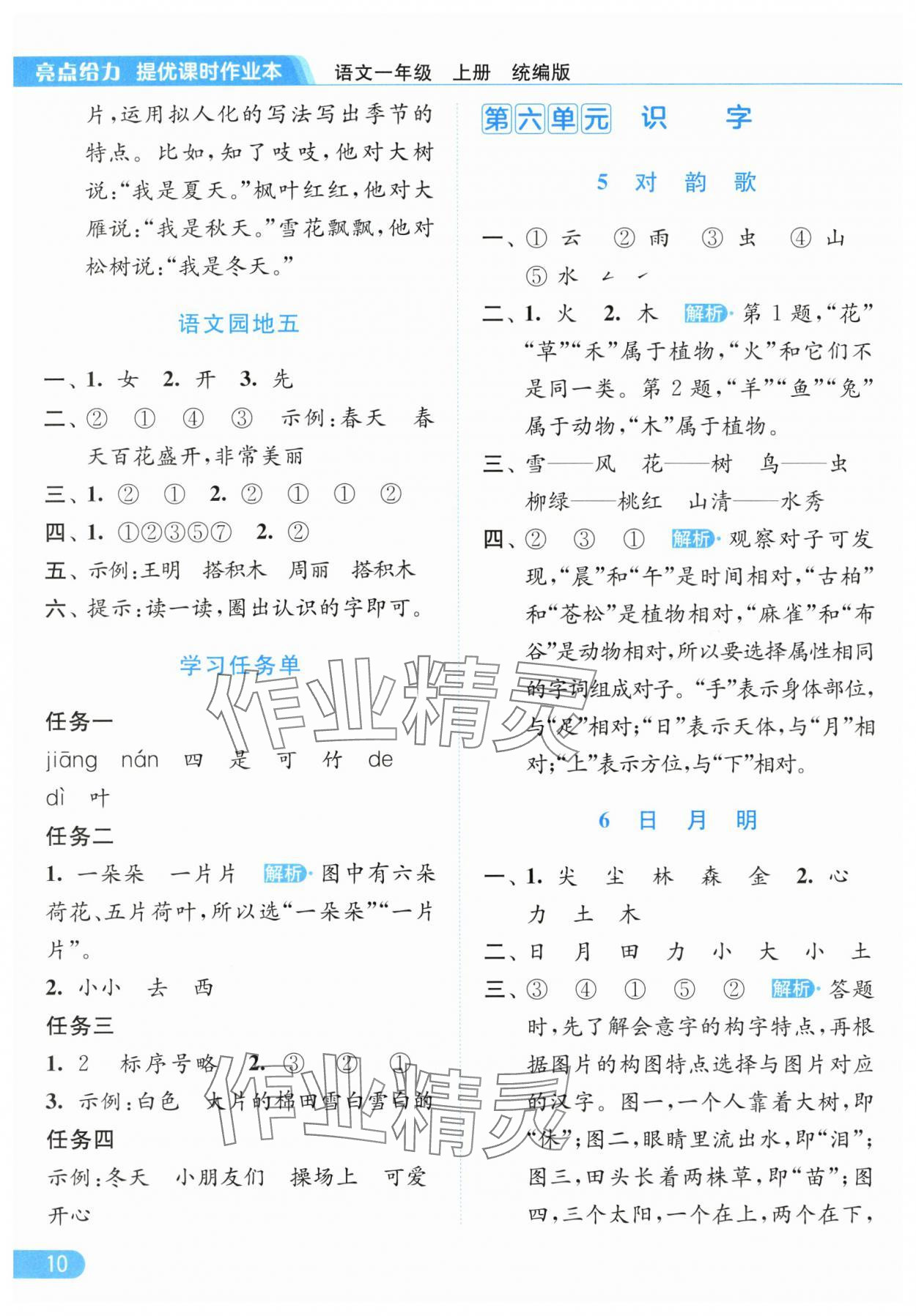 2025年亮点给力提优课时作业本一年级语文上册人教版参考答案第10页
