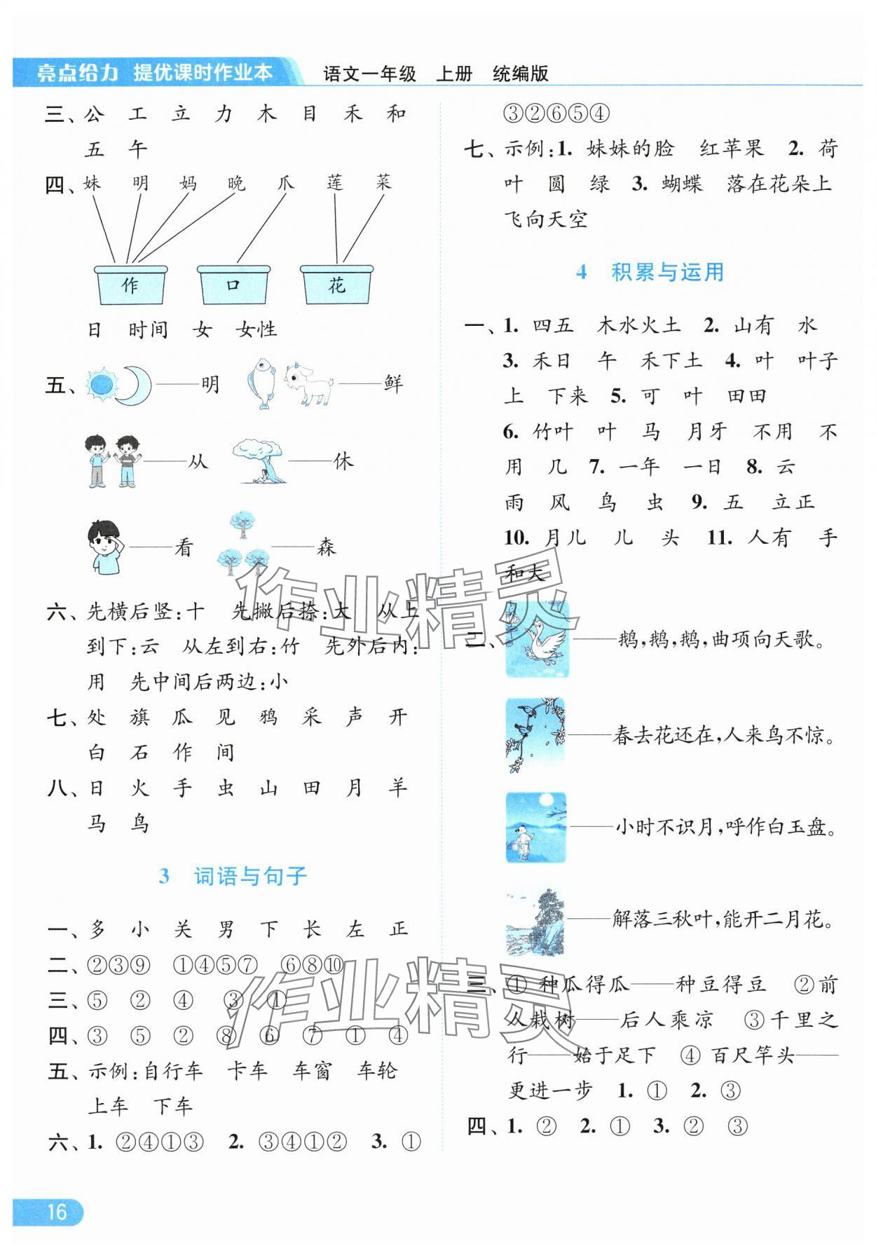 2025年亮点给力提优课时作业本一年级语文上册人教版参考答案第16页
