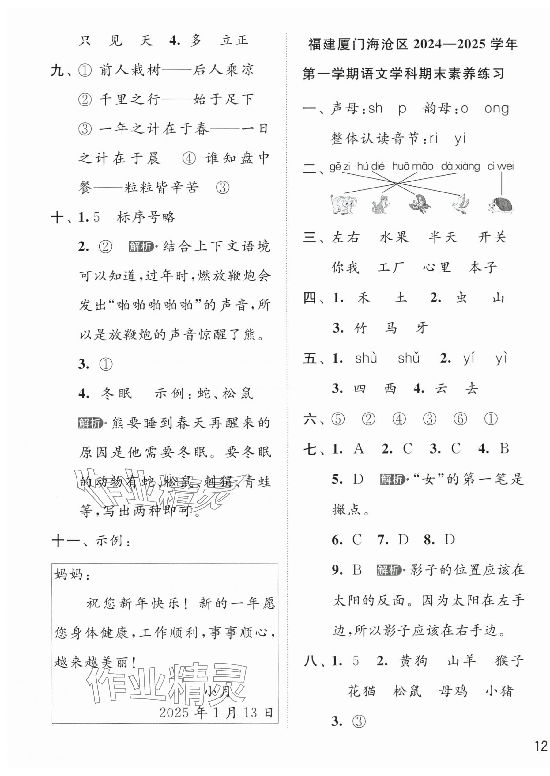 2025年亮点给力提优课时作业本一年级语文上册人教版第25页