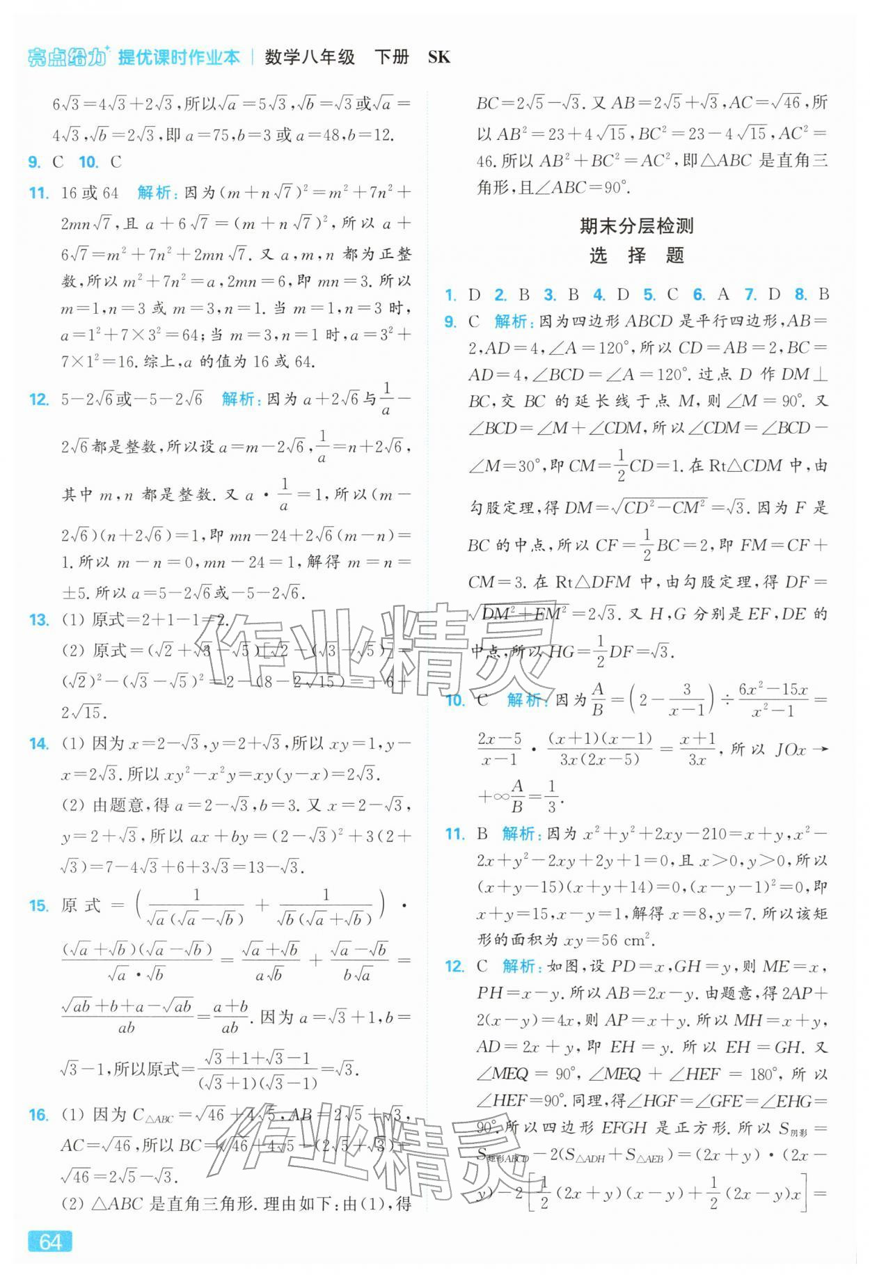2026年亮点给力提优课时作业本八年级数学下册苏科版参考答案第64页