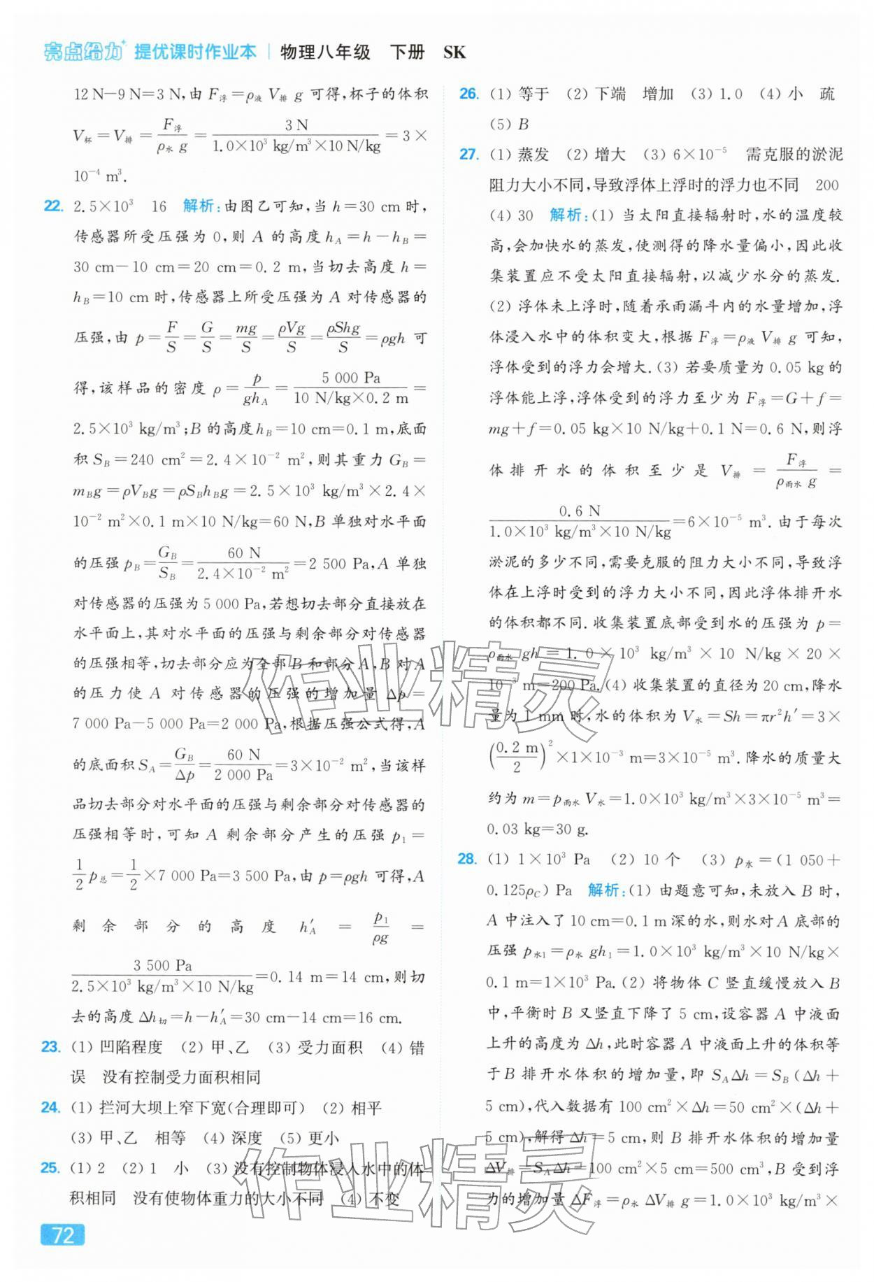 2026年亮点给力提优课时作业本八年级物理下册苏科版参考答案第72页