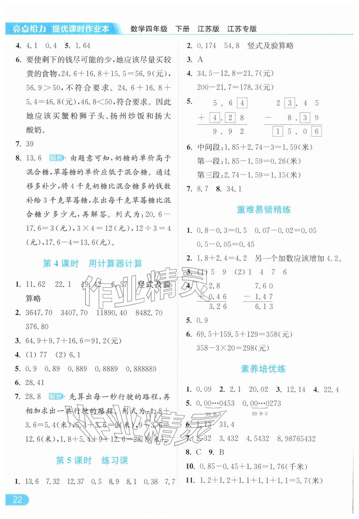 2026年亮点给力提优课时作业本四年级数学下册苏教版江苏专版参考答案第22页