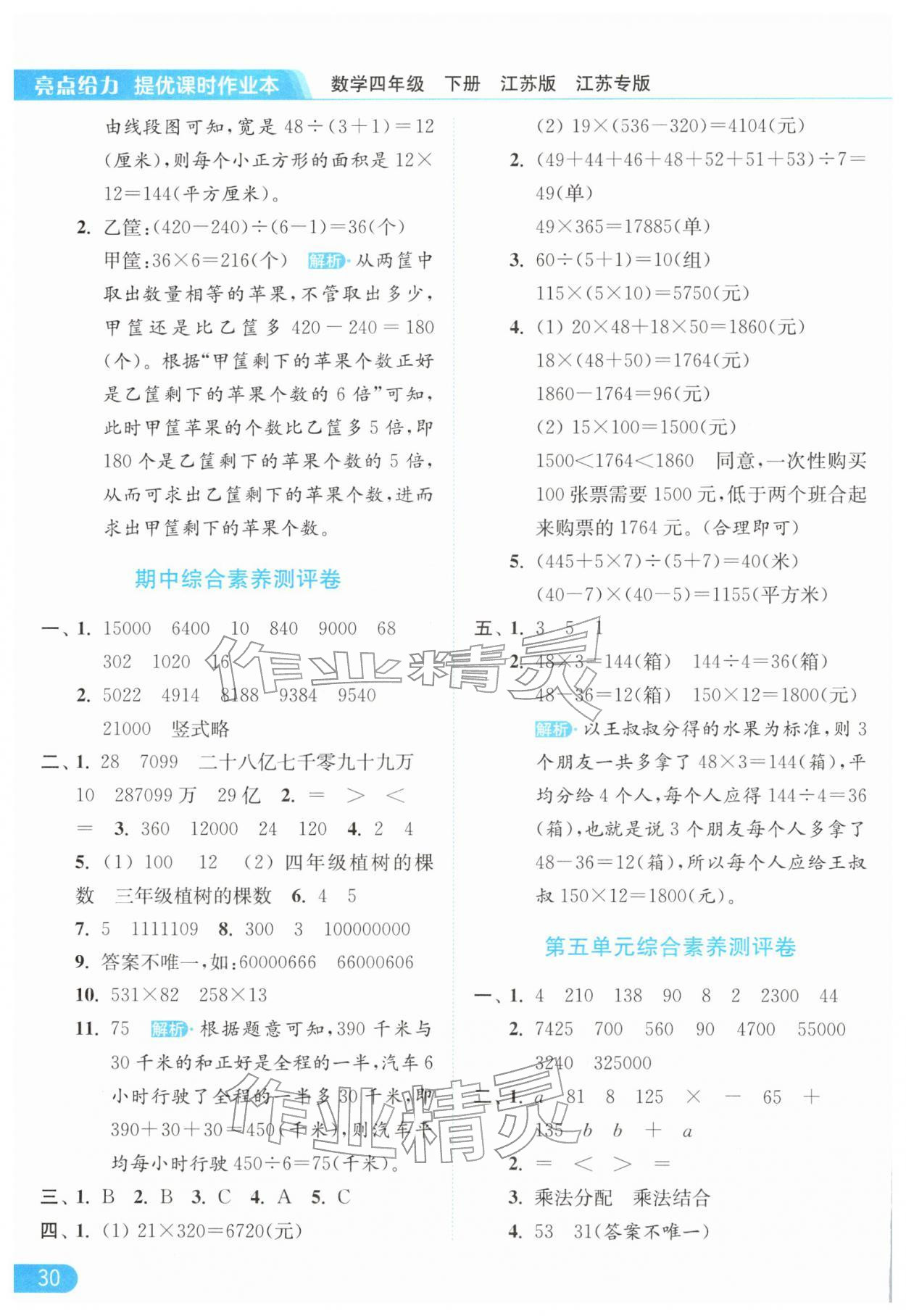 2026年亮点给力提优课时作业本四年级数学下册苏教版江苏专版参考答案第30页