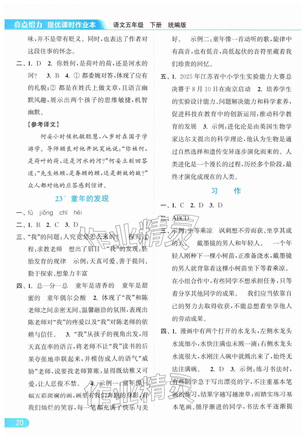 2026年亮点给力提优课时作业本五年级语文下册统编版参考答案第20页