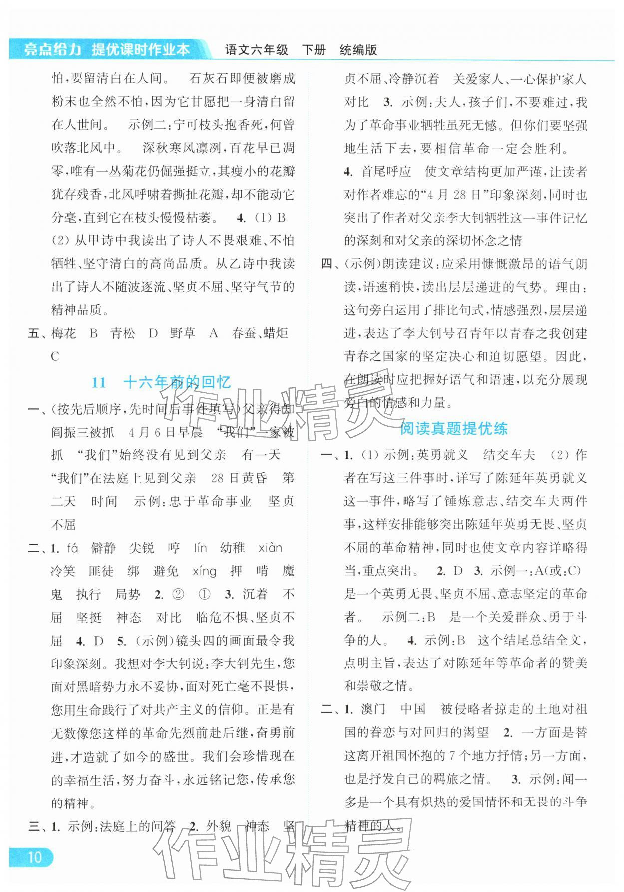 2026年亮点给力提优课时作业本六年级语文下册统编版参考答案第10页