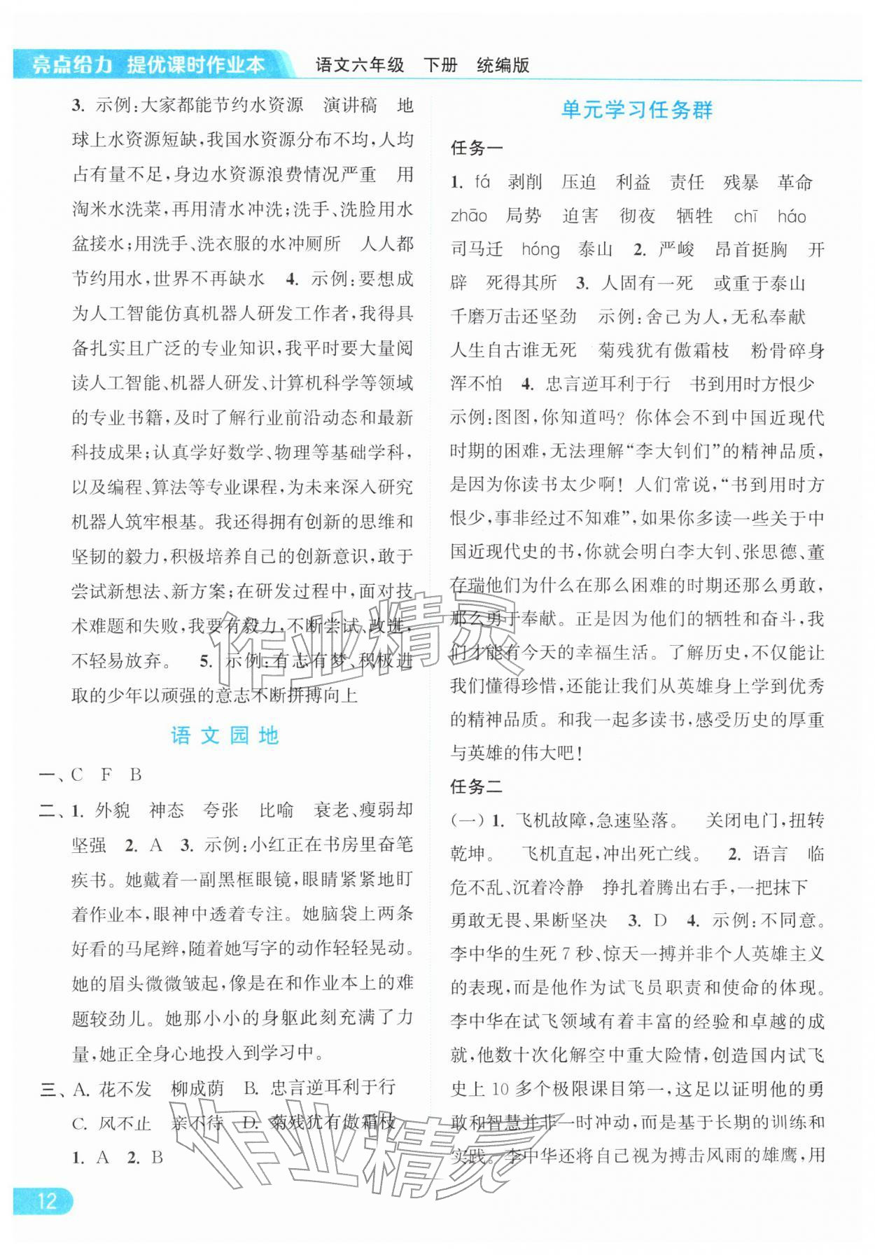 2026年亮点给力提优课时作业本六年级语文下册统编版参考答案第12页