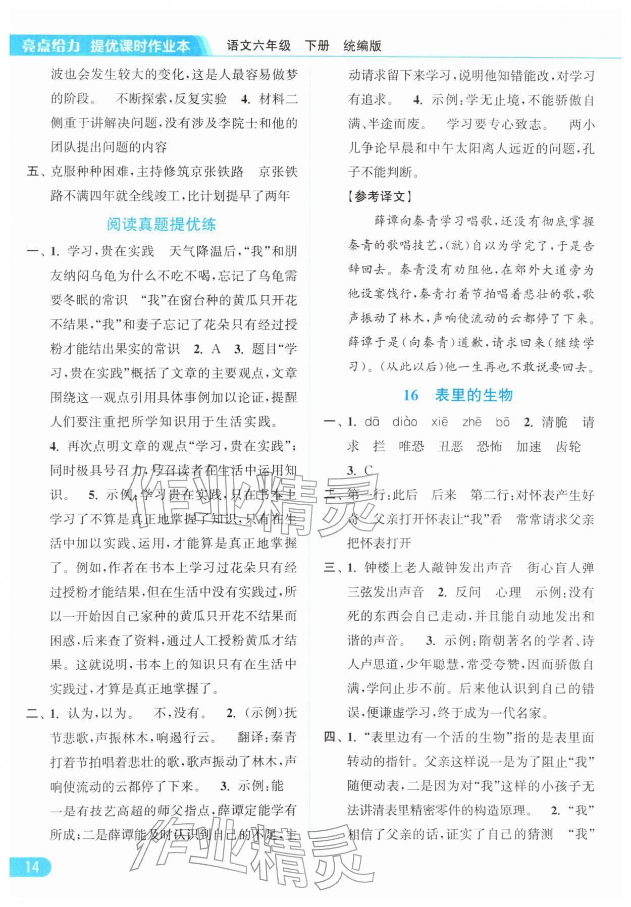 2026年亮点给力提优课时作业本六年级语文下册统编版参考答案第14页