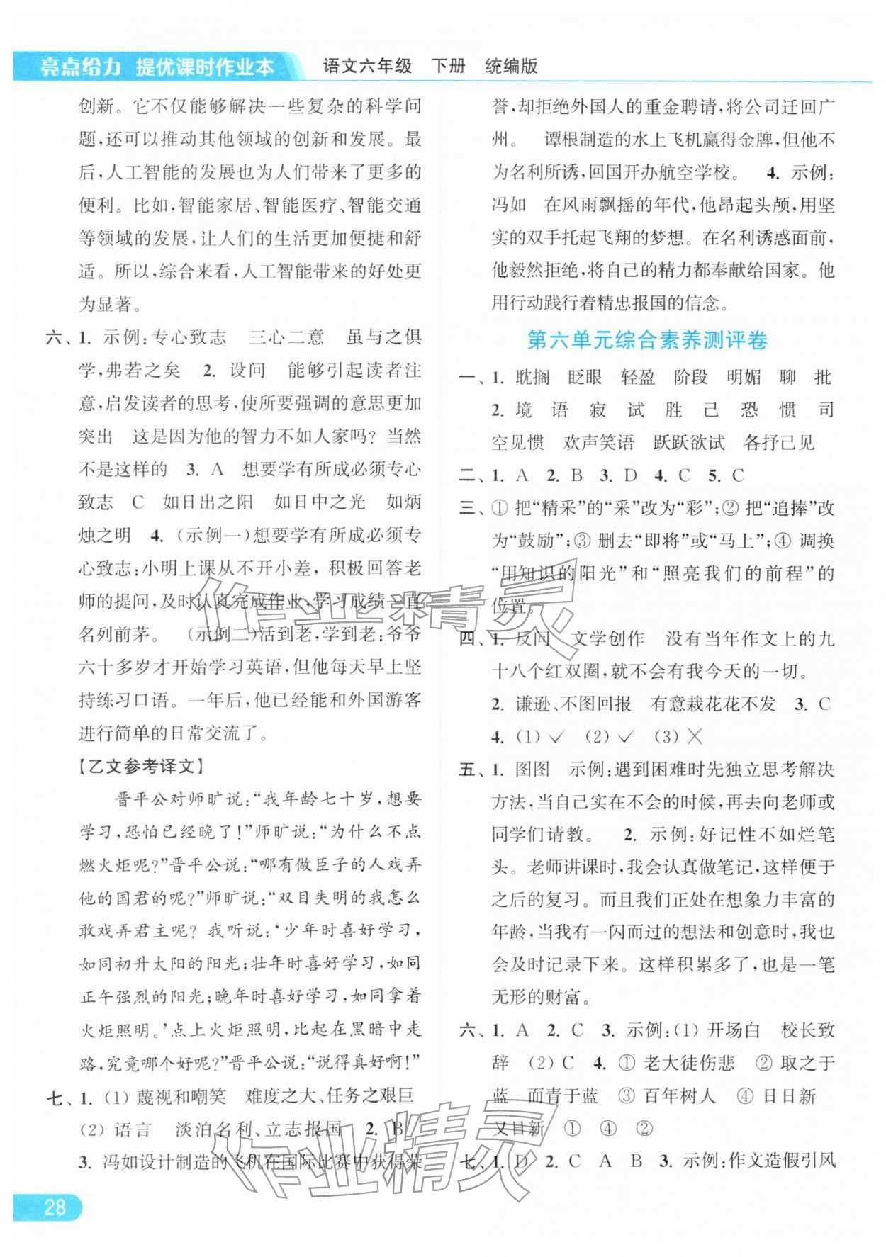 2026年亮点给力提优课时作业本六年级语文下册统编版参考答案第28页