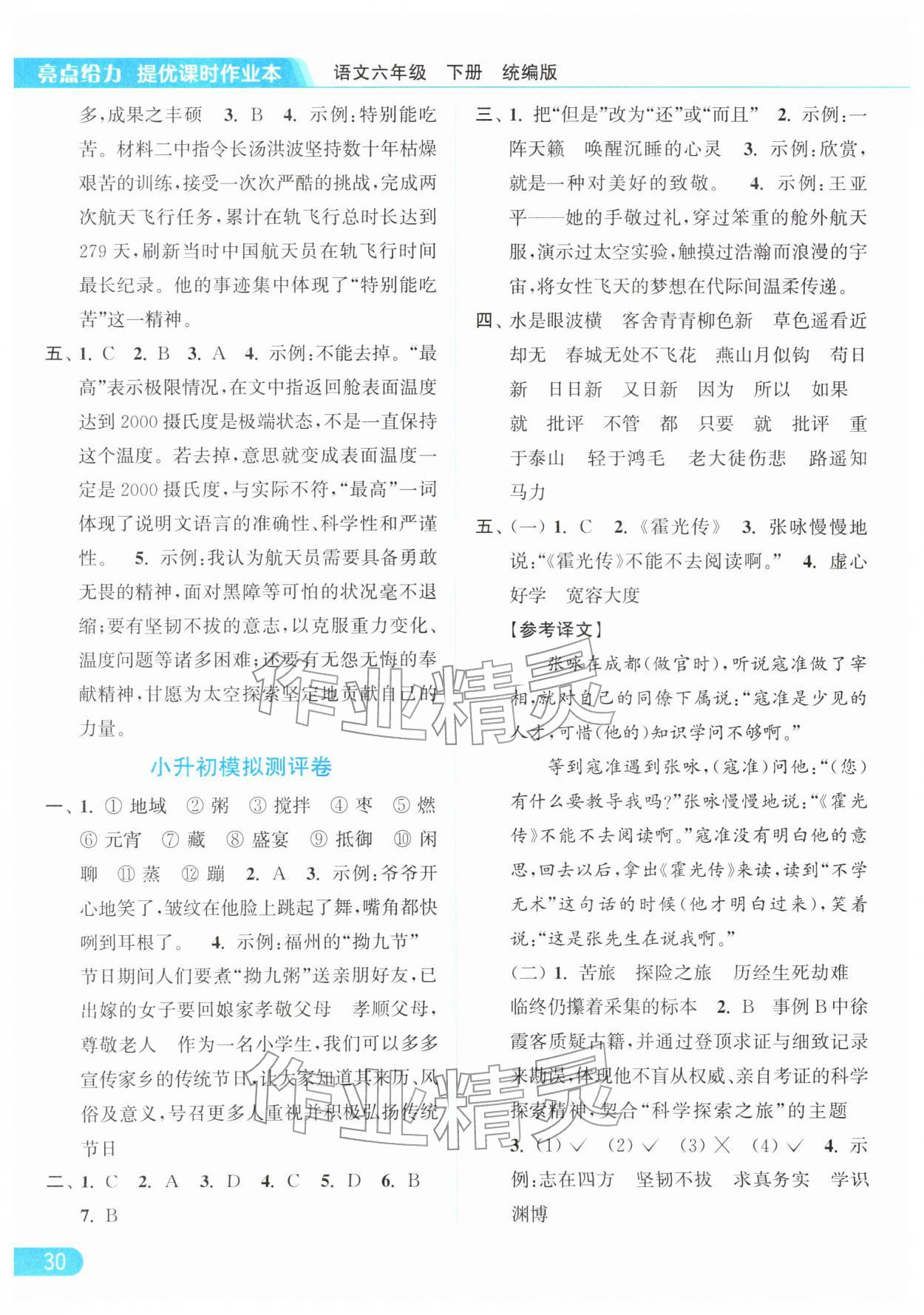 2026年亮点给力提优课时作业本六年级语文下册统编版参考答案第30页