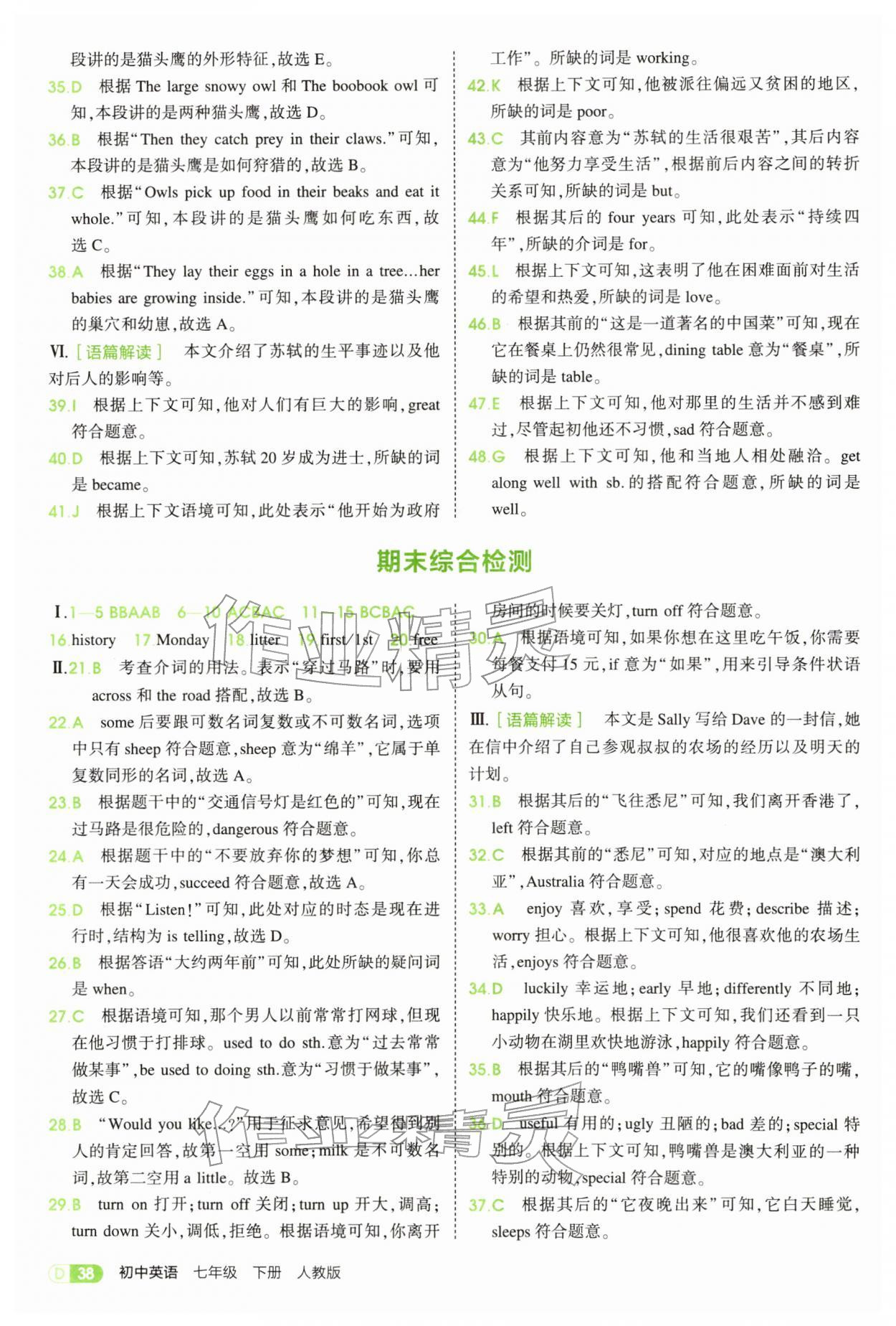 2026年5年中考3年模拟七年级英语下册人教版参考答案第38页
