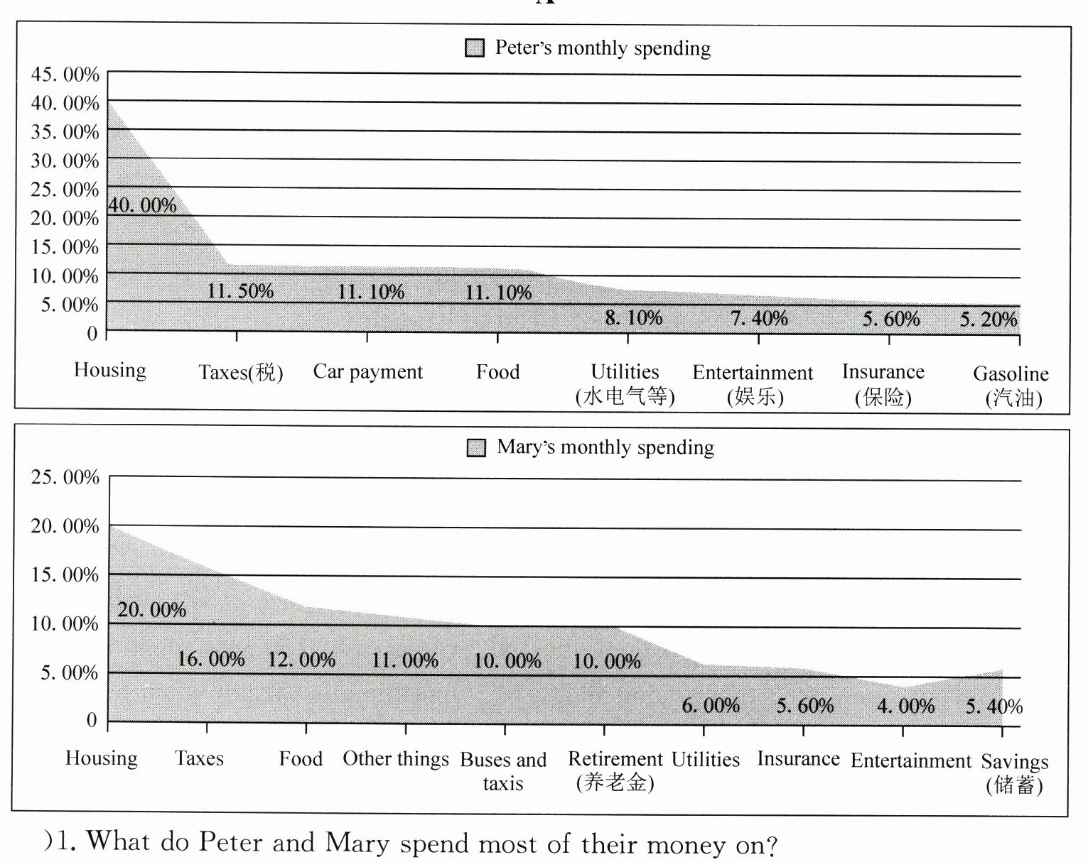 )1. What do Peter and Mary spend most of their money on?A. Food. B. Taxes. C. Housing. D. Utilities.