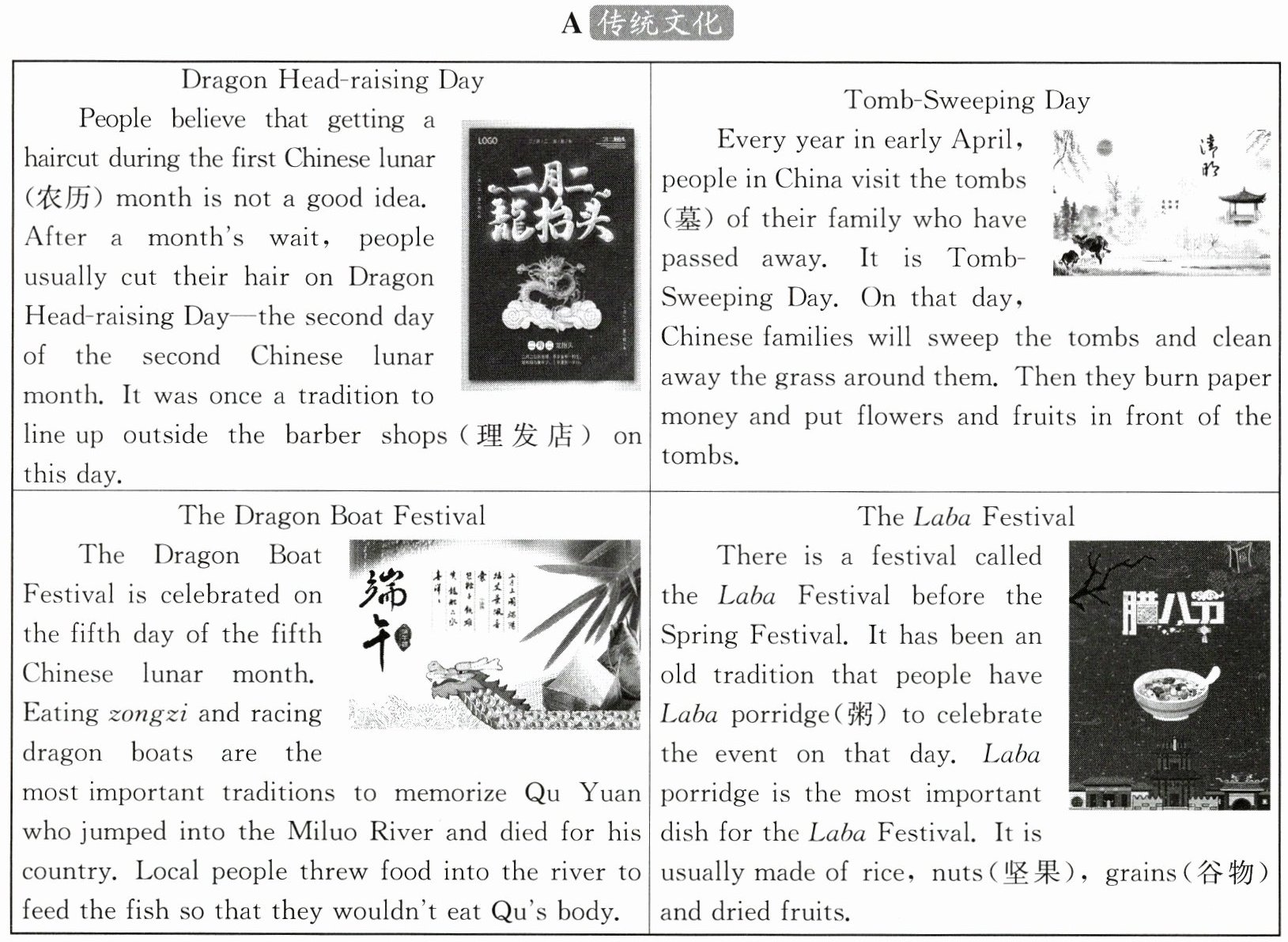 答案:1.C 【点拨】根据“People believe that getting a haircut during the first Chinese lunar(农历)month is not a good idea.”可知,人们认为农历的第一个月剪头发不好,故推断人们在农历的第一个月应该注意不要剪头发。故选 C。