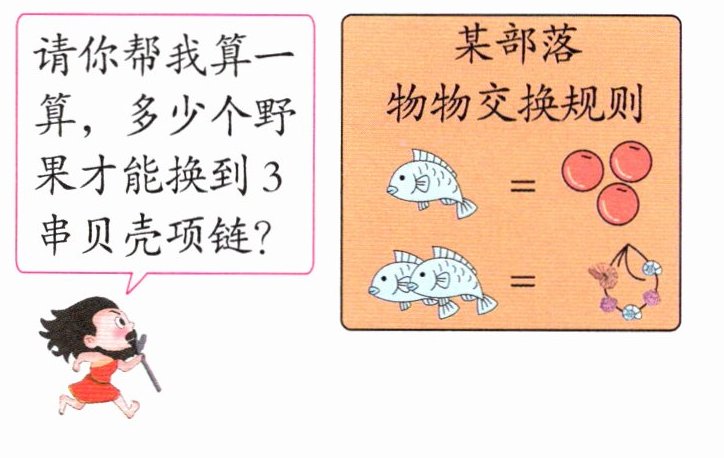 答案:$ 2 × 3 = 6 $(条) $ 3 × 6 = 18 $(个)解析:由题图可知,2条鱼可以换1串贝壳项链,换到1条鱼需要3个野果。可以先求出换到3串贝壳项链一共需要 $ 2 × 3 = 6 $(条)鱼,再求换到6条鱼需要 $ 3 × 6 = 18 $(个)野果,即18个野果才能换到3串贝壳项链。
