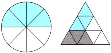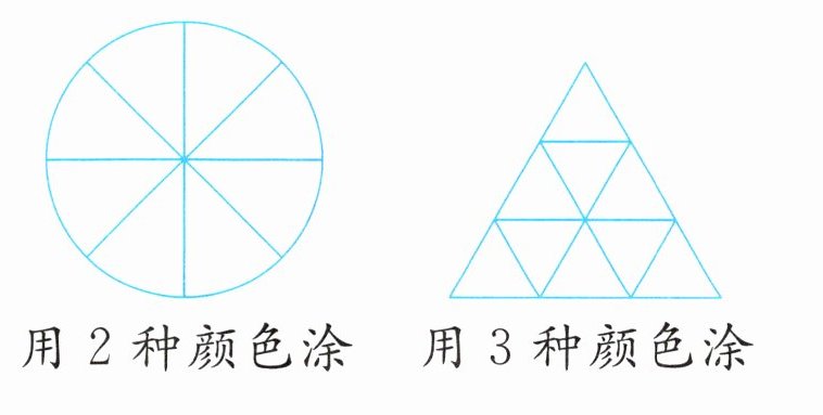 解析.观察第一个图形(圆被分成8份),要用2种颜色涂且数量相同,就是把8平均分成2份,每种颜色涂4份。观察第二个图形(大三角形被分成9份),要用3种颜色涂且数量相同,就是把9平均分成3份,所以每种颜色涂3份。