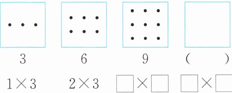 12 $3 × 4 = 12$ 解析:后一幅图比前一幅图依次多一行,即3个黑点,第一幅图是1个3,第二幅图是2个3,第三幅图是3个3,那么第四幅图是4个3。