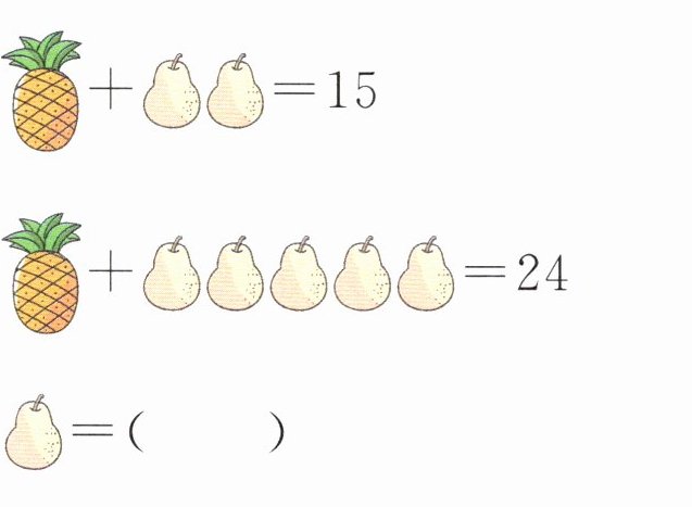 答案:3 解析:上、下两个算式对比来看,24比15多9,正好多3个梨,也就是3个梨表示9,因为 $9=3×3$,所以每个梨表示3。