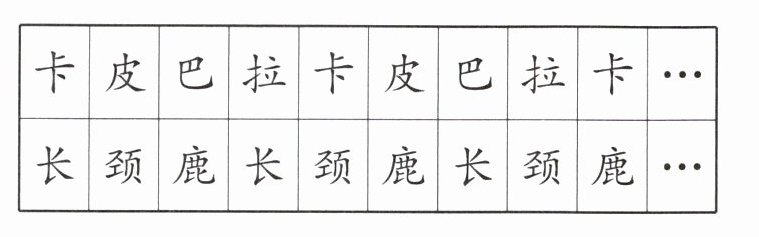 6. (南京玄武区期末)南京市红山森林动物园是国家 4A 级风景名胜区,拥有澳洲动物展区、大象馆、斑马馆、狮虎山、企鹅馆、猩猩馆等近 20 个展馆。亮亮参观完红山动物园后,最喜欢的动物是卡皮巴拉(水豚)和长颈鹿,于是在纸条上按照下面的顺序誊抄它们的名字。第 28 列从上到下依次是哪两个汉字?