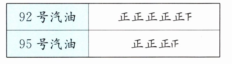 3. 新情境 真实生活 李叔叔在加油站统计各类车所加汽油型号的情况,并用画“正”字的方法记录了下来。(一画表示1次,一个“正”字表示5次)