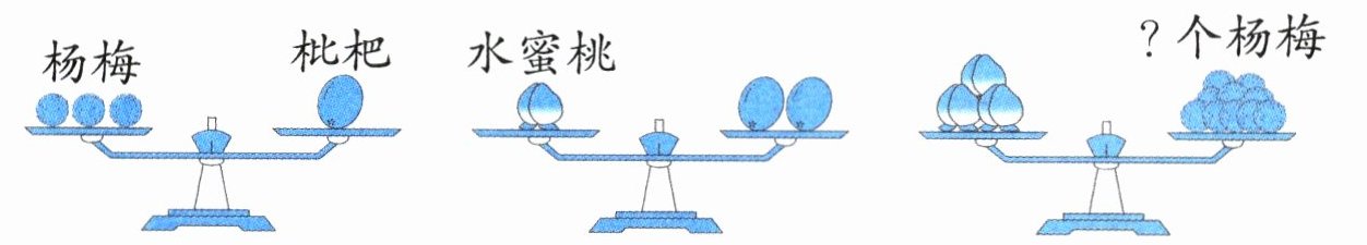 4. 新情境 传统文化 小满是二十四节气中的第八个节气。“枇杷黄后杨梅紫,正是农家小满天。”根据下图算一算,最后一个天平上有(