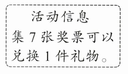 可以兑换 3 件礼物,还剩 2 张奖票。$7 - 2 = 5$ (张)