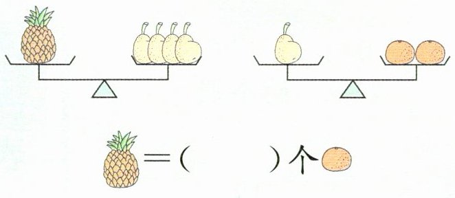 思路分析 要求1个菠萝和几个橘子一样重,可以根据第二幅图中1个梨和2个橘子一样重,推算出4个梨和$4×2 = 8$(个)橘子一样重。因为1个菠萝和4个梨一样重,而4个梨又和8个橘子一样重,所以就把4个梨换成8个橘子,由此得出1个菠萝和