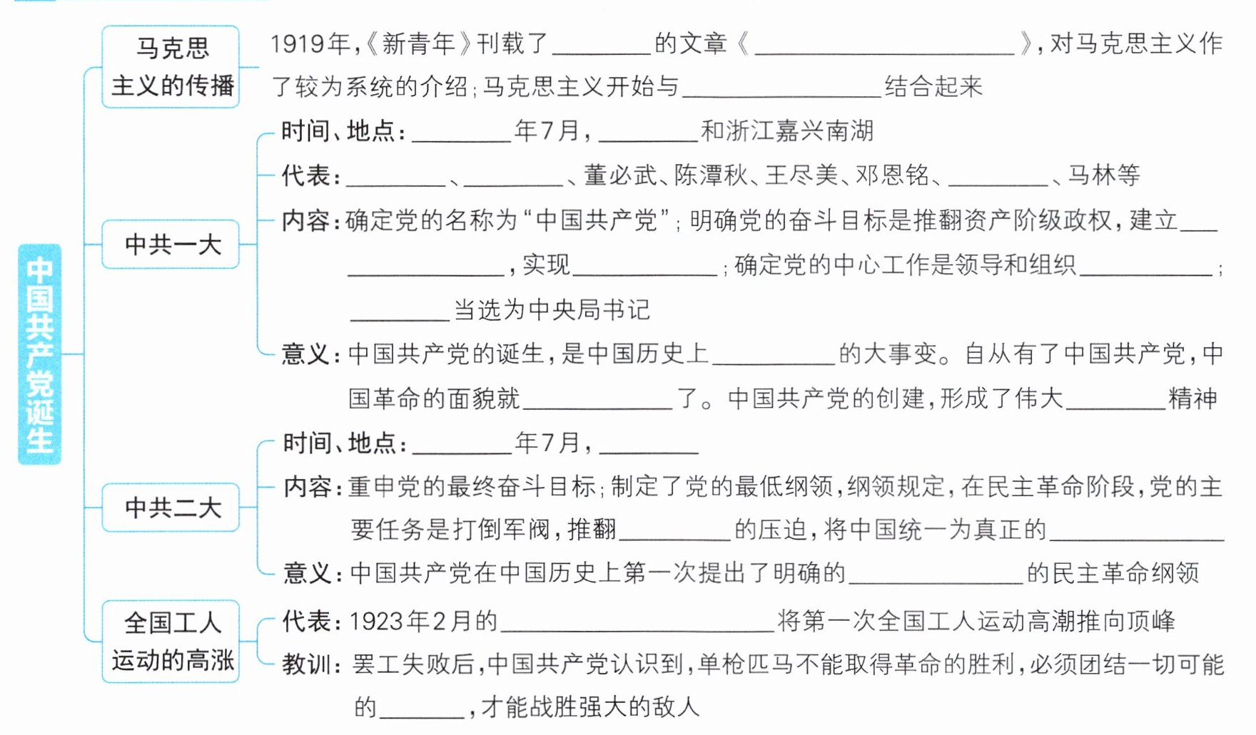 答案:[核心知识梳理] 李大钊 我的马克思主义观 中国工人运动 1921 上海 毛泽东 何叔衡 李达 无产阶级专政 共产主义 工人运动 陈独秀 开天辟地 焕然一新 建党 1922 上海 帝国主义 民主共和国 反帝反封建 京汉铁路工人大罢工 同盟者