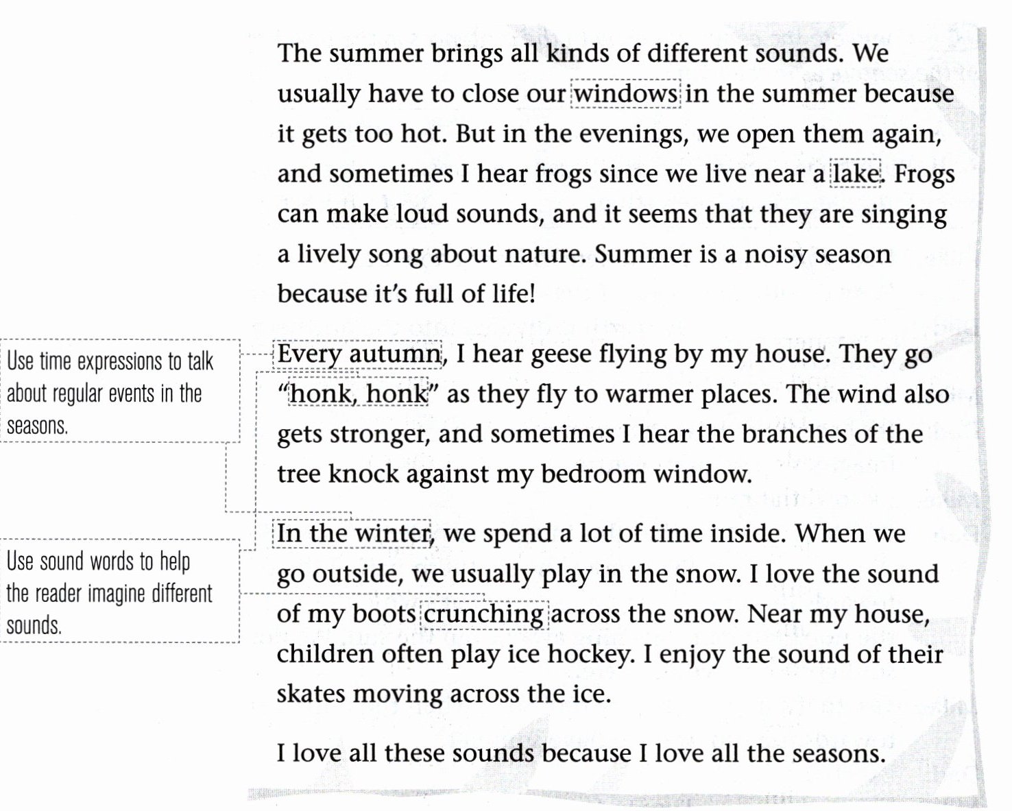 B When you think about the different seasons, what sounds come to mind? Write an essay about the sounds of the seasons.